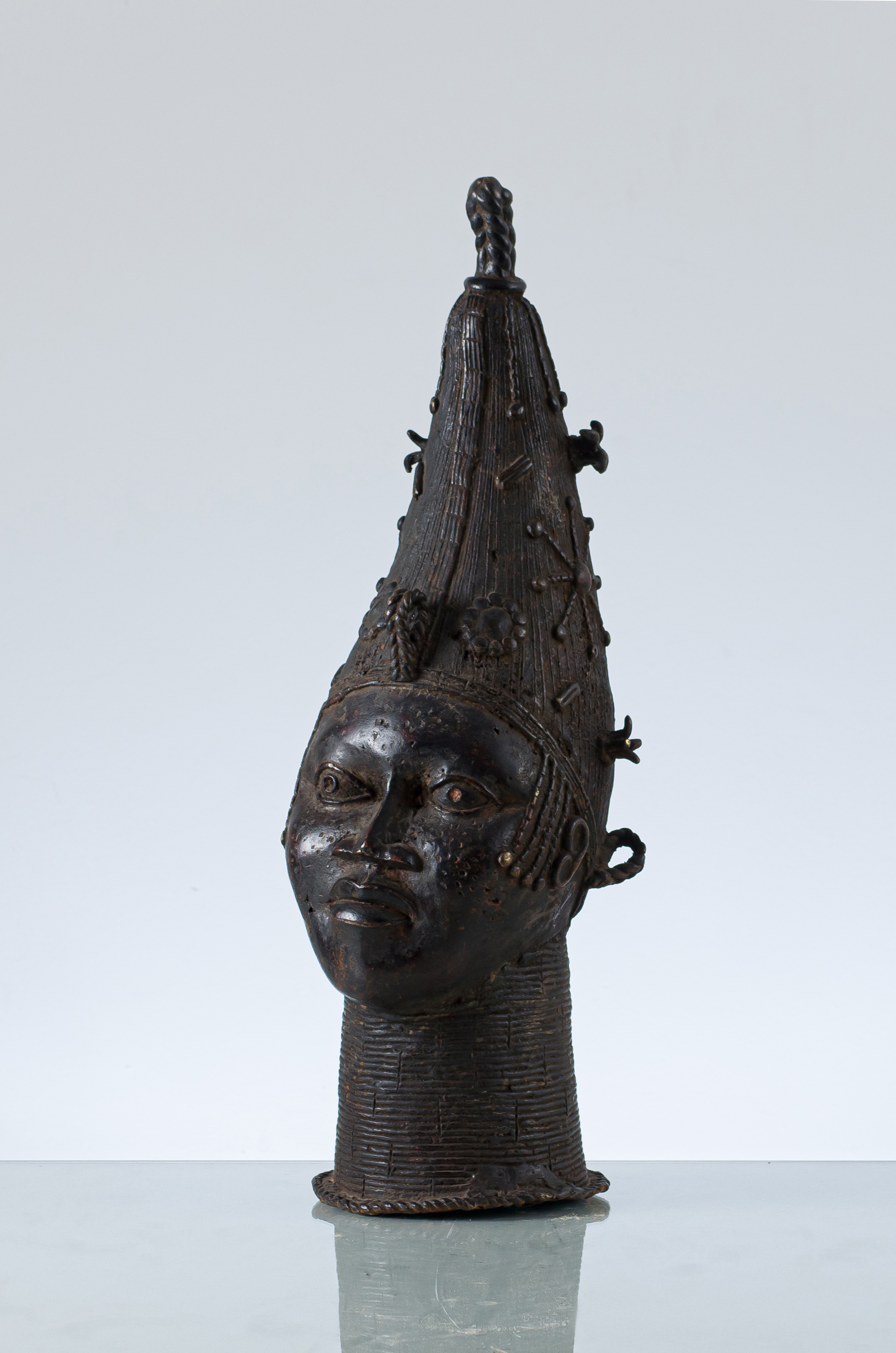 Scultura in bronzo raffigurante "Testa di donna con copricapo"