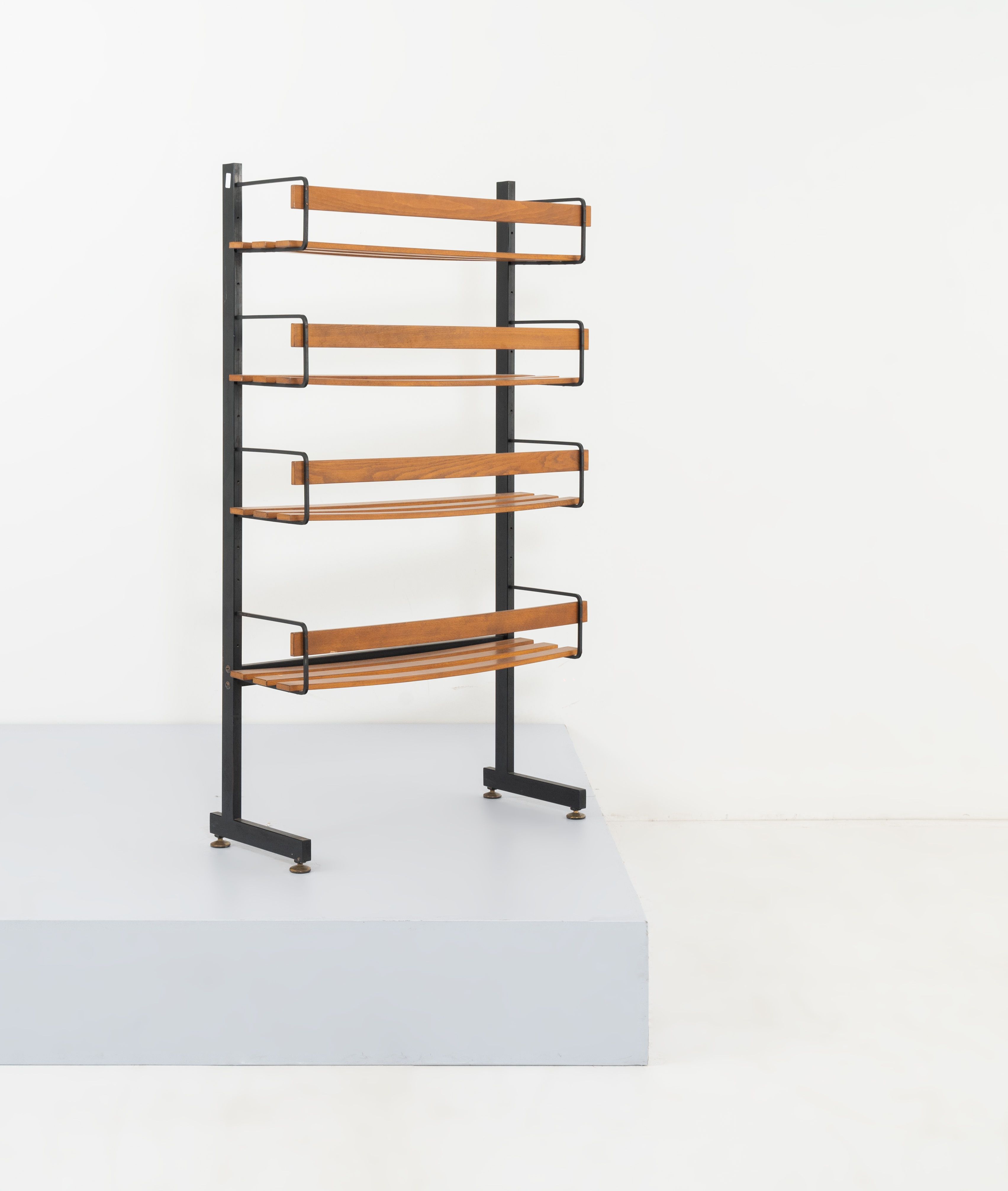Libreria con struttura in metallo verniciato nero, quattro ripiani regolabili in altezza in doghe di legno. Segni di uso.