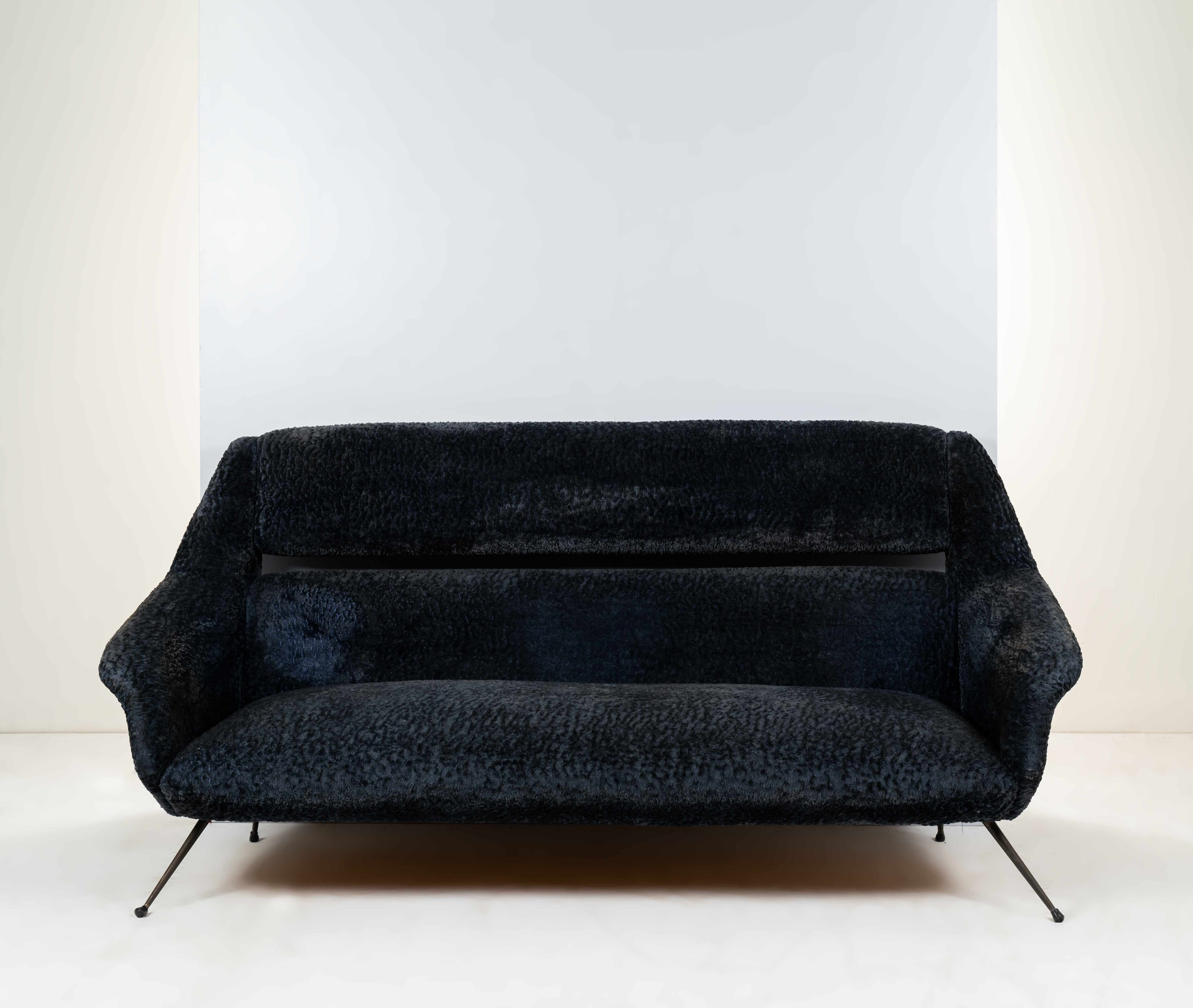 Divano con struttura in legno, imbottitura e rivestimento in tessuto originale di velluto blu, spalliera con cavità orizzontale, piedi in metallo a spillo. Segni di uso e difetti.
