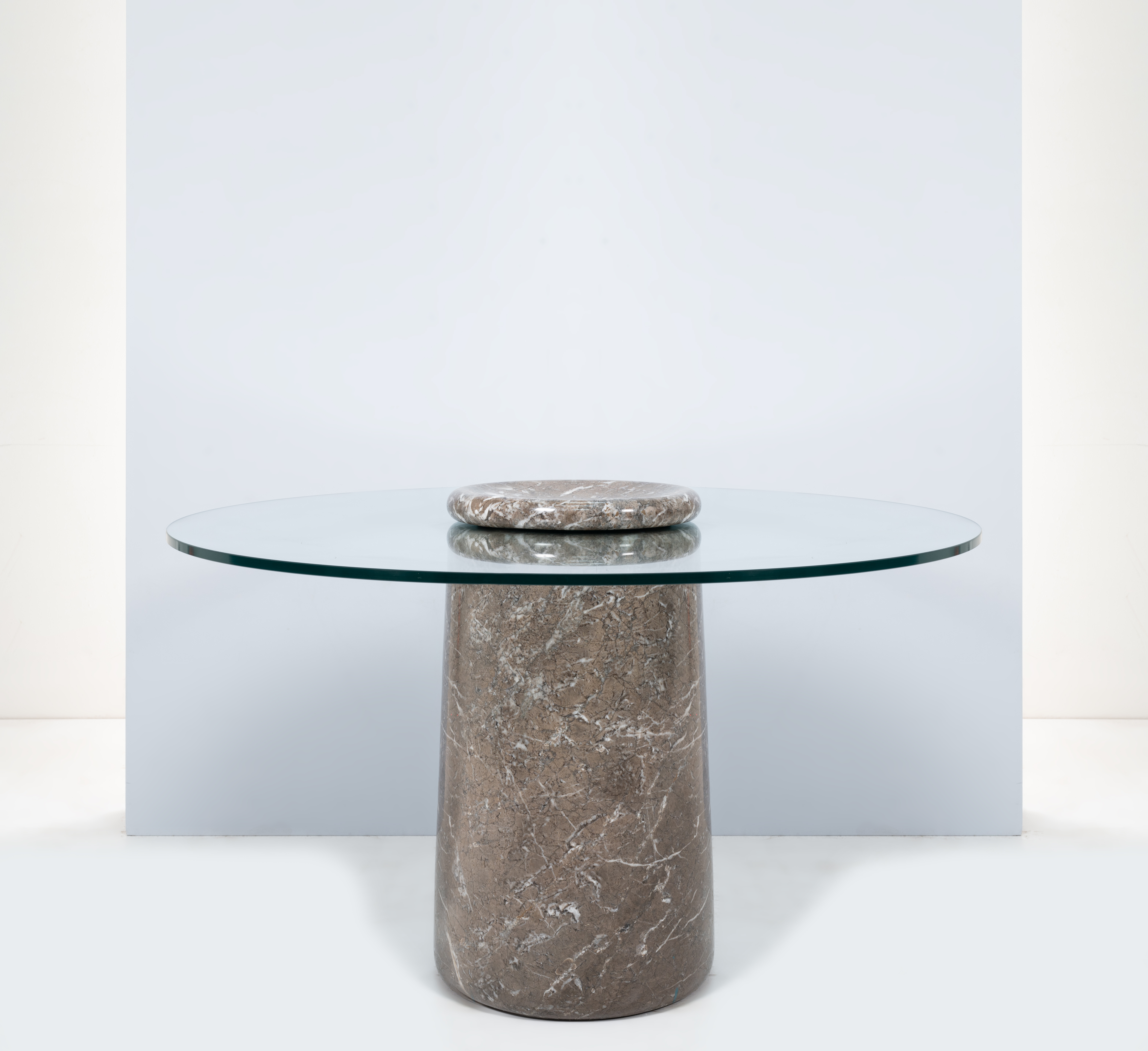 Tavolo da pranzo modello “Castore” in marmo grigio venato di bianco, piano circolare in vetro trasparente, vassoio in marmo.