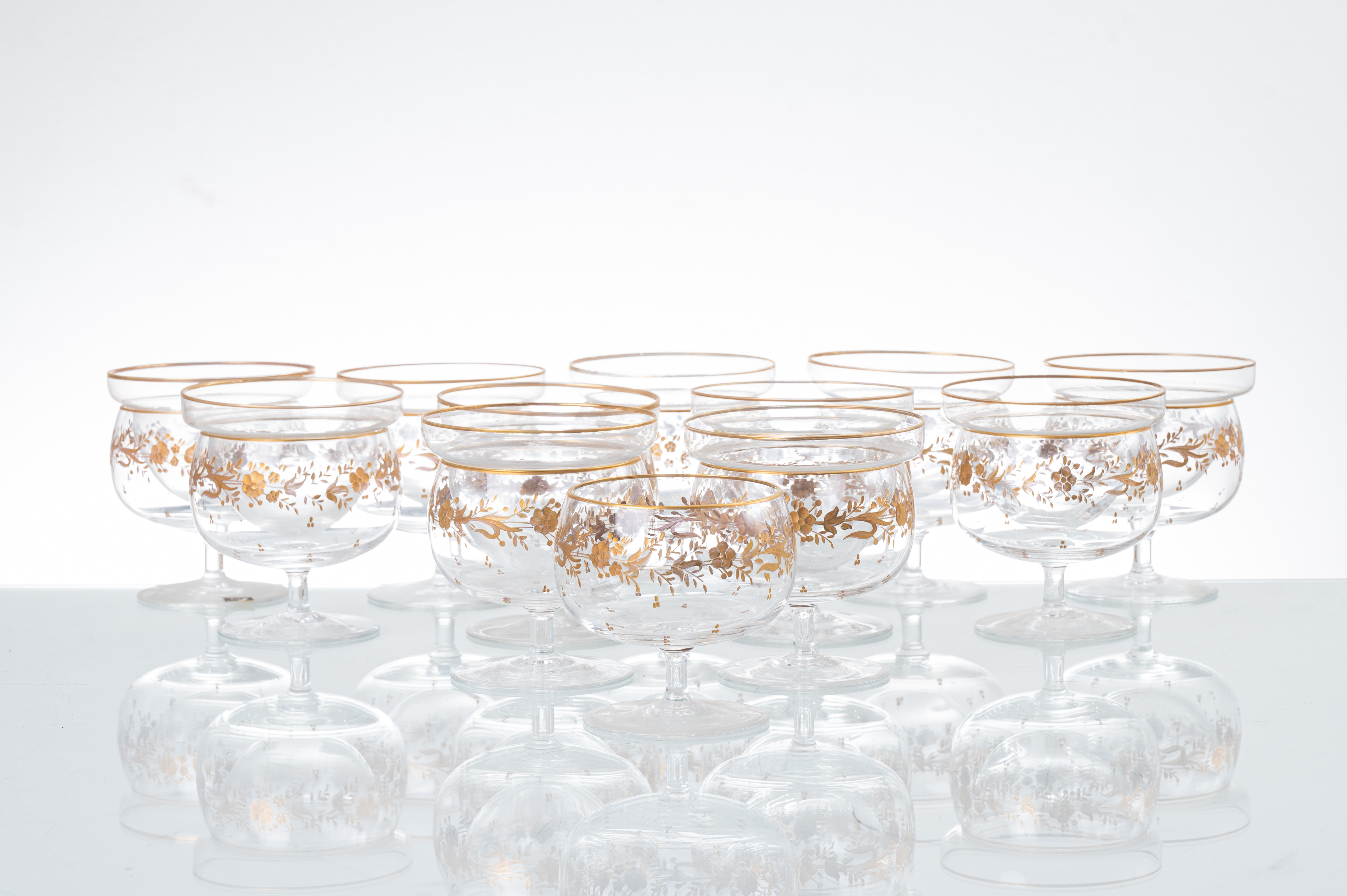 Dodici coppe da caviale in vetro con decori in oro a motivo floreale (una coppetta interna mancante).