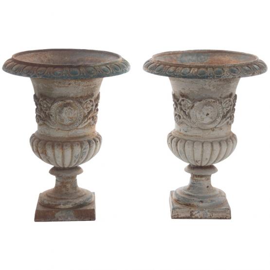 Coppia di crateri in ghisa lavorati a motivi floreali con personaggi di profilo in medaglioni centrali.