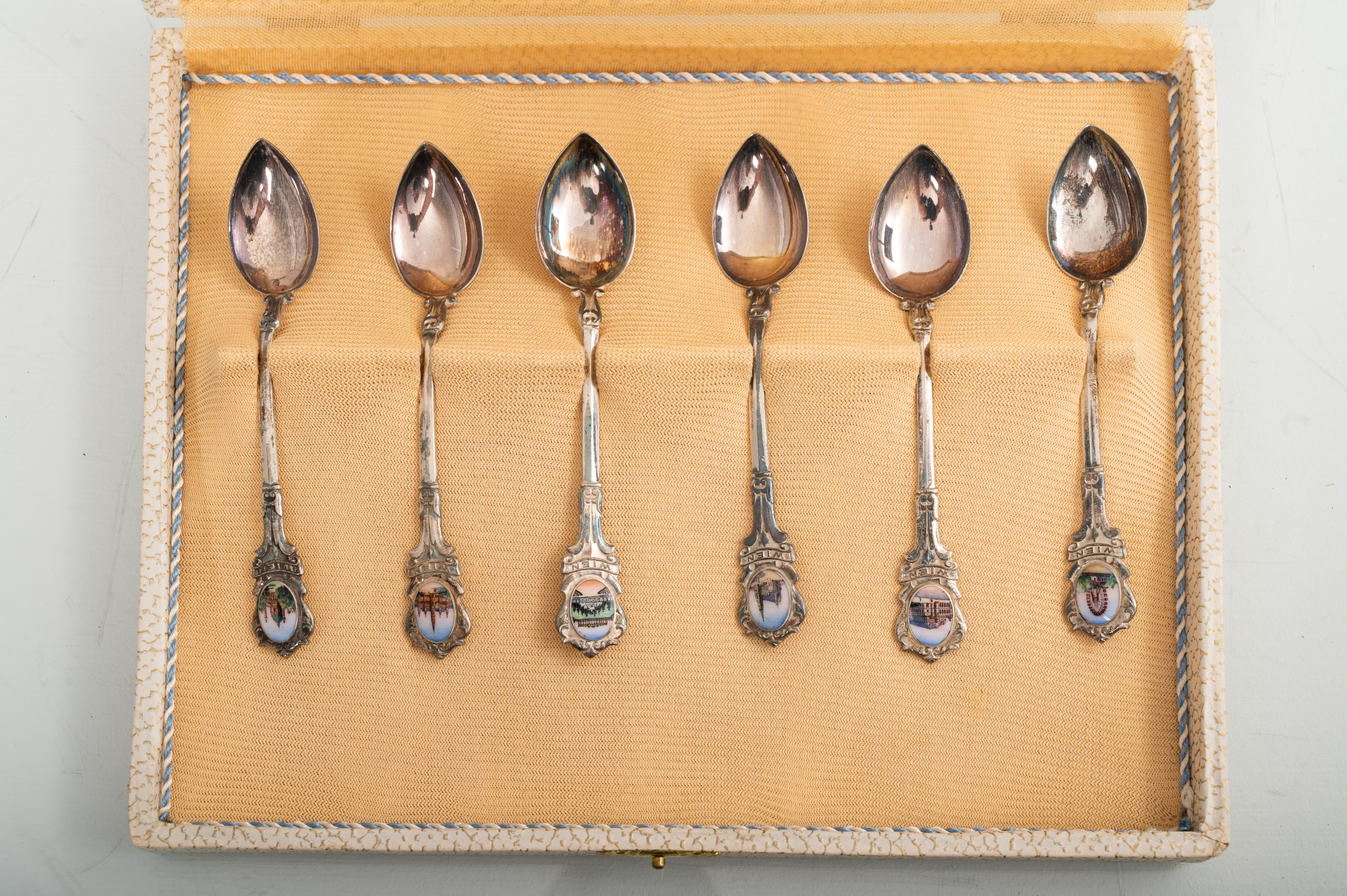 Sei cucchiaini in argento con smalti in porcellana entro scatola.