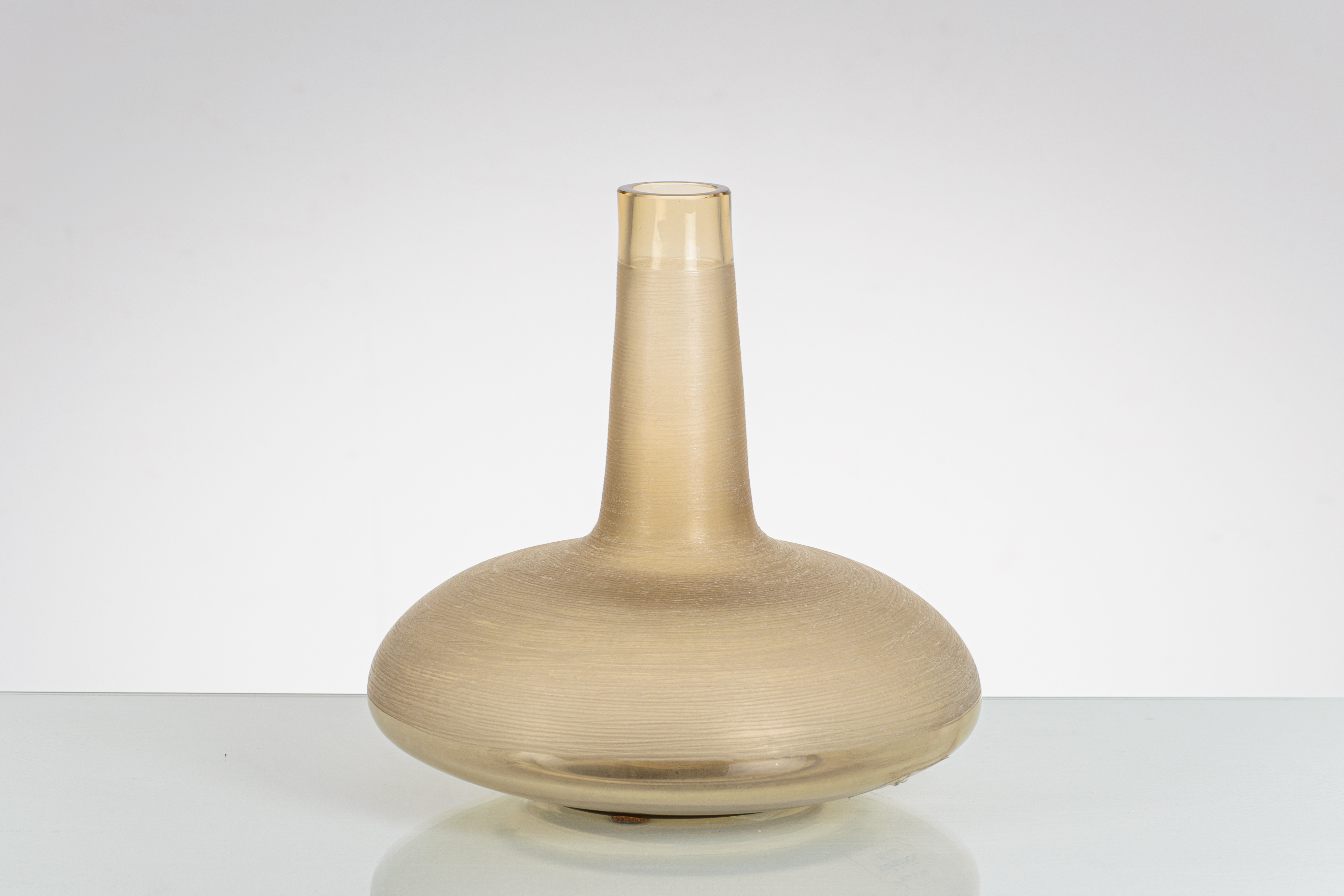 Vaso in vetro fumè parzialmente trasparente e battuto, corpo a disco con lungo collo e bocca piana circolare. Firma.