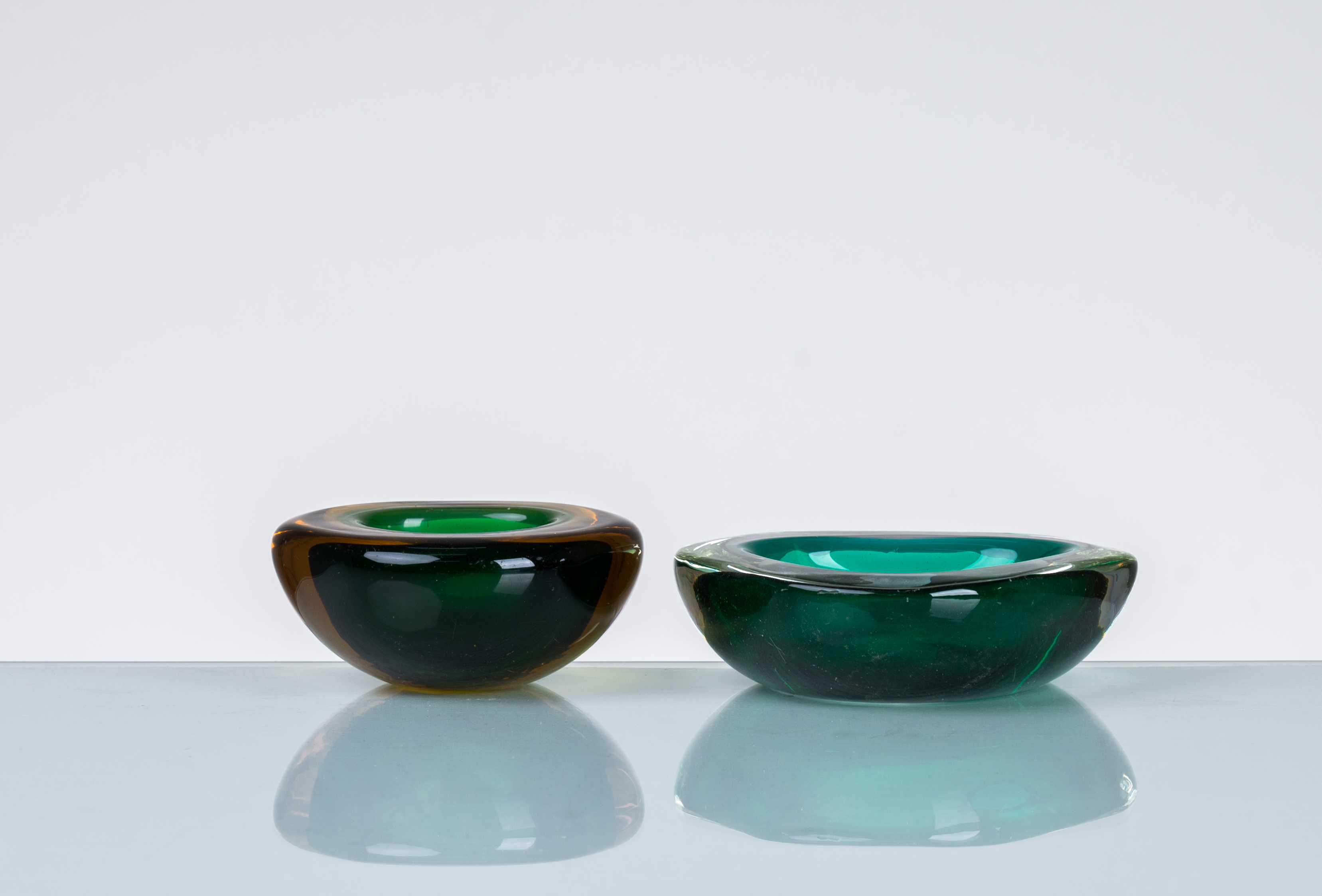 Due posacenere di grandezza differente in vetro sommerso uno giallo e verde ed uno verde, corpo triangolare con angoli arrotondati.