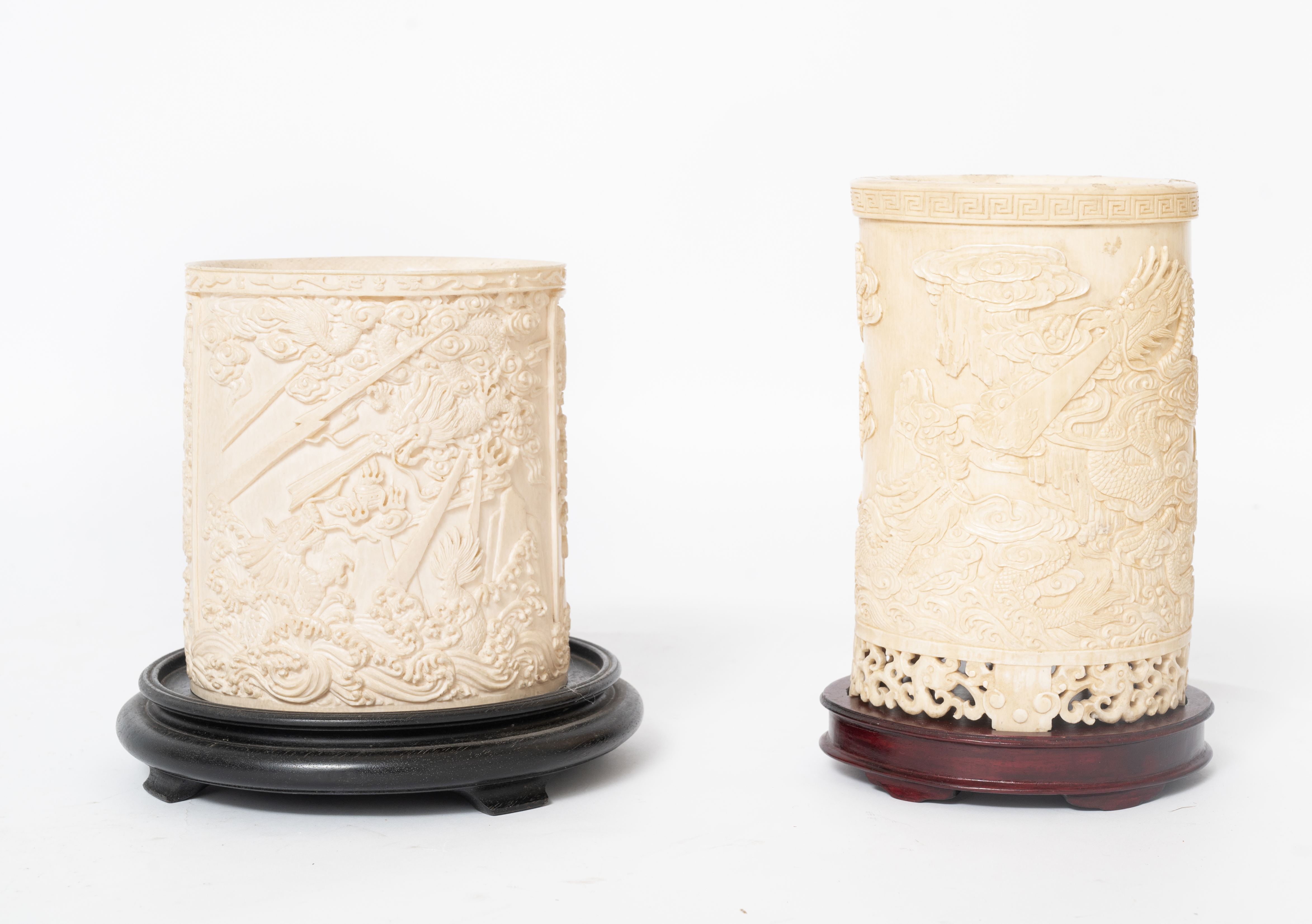Due cilindri in avorio riccamente scolpiti con basi in legno ebanizzato. Le opere sono corredate da certificato Cites.