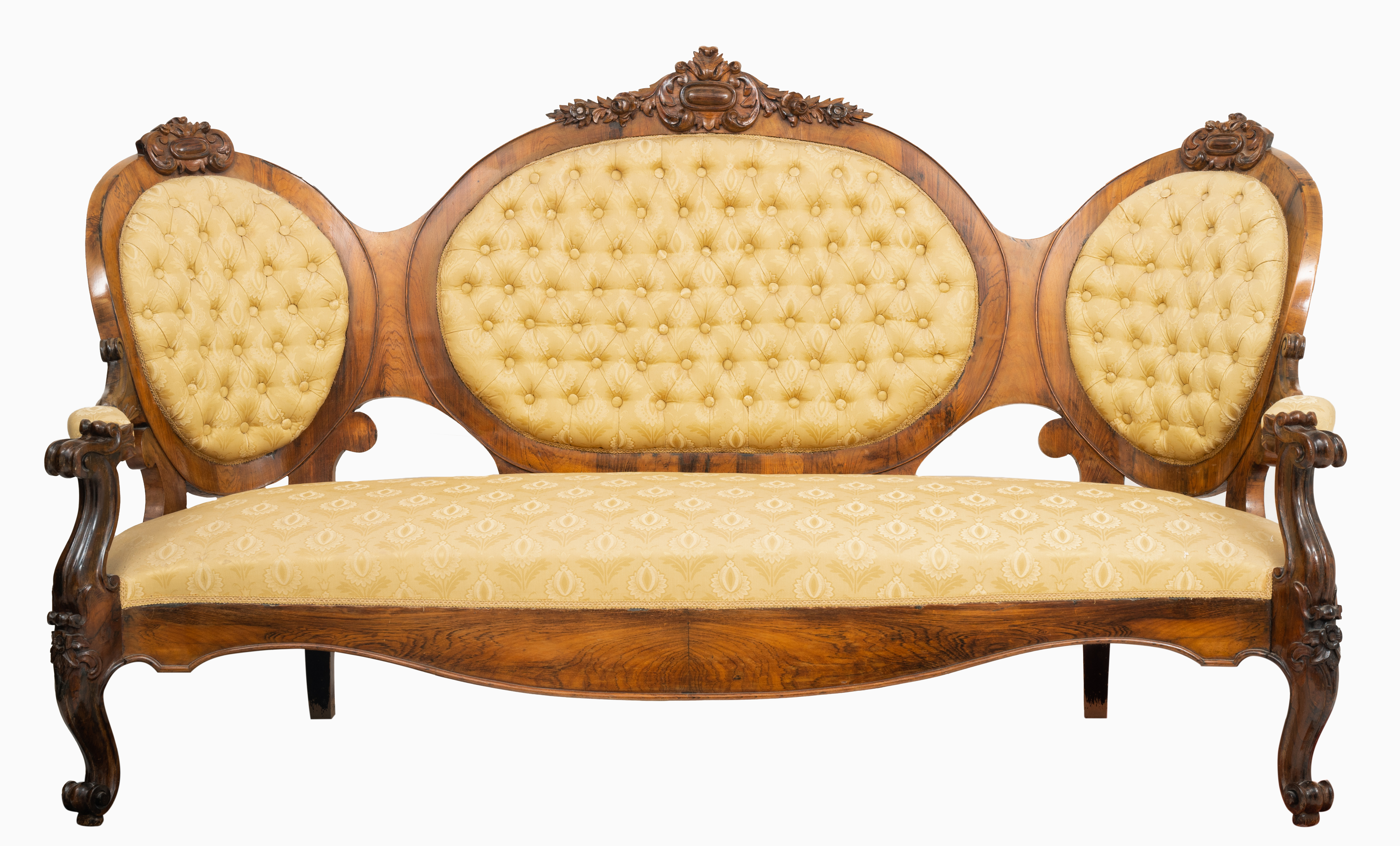 Divano a tre posti Luigi Filippo in legno esotico, tessuto nei toni del giallo con spalliera capitonné.