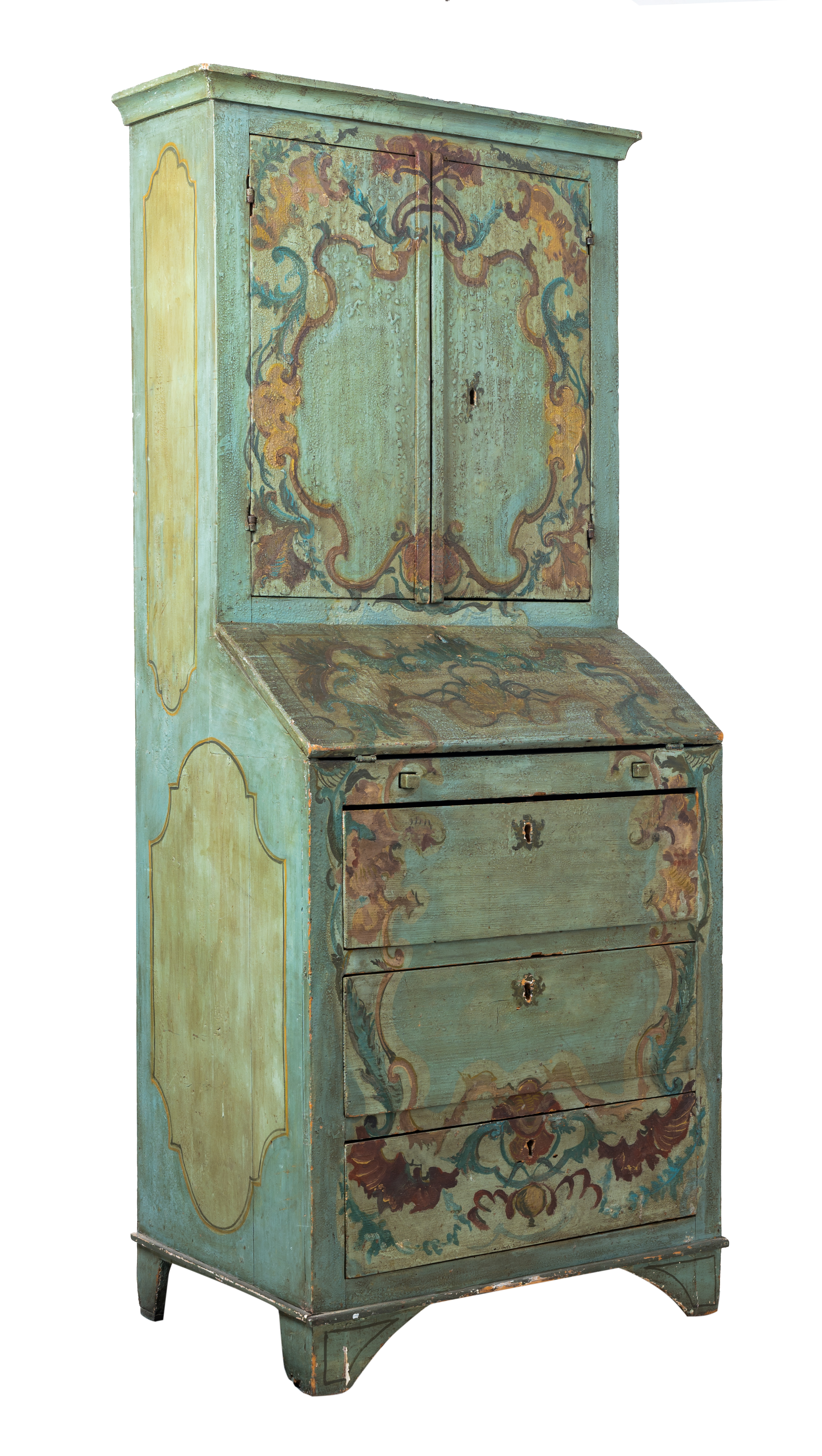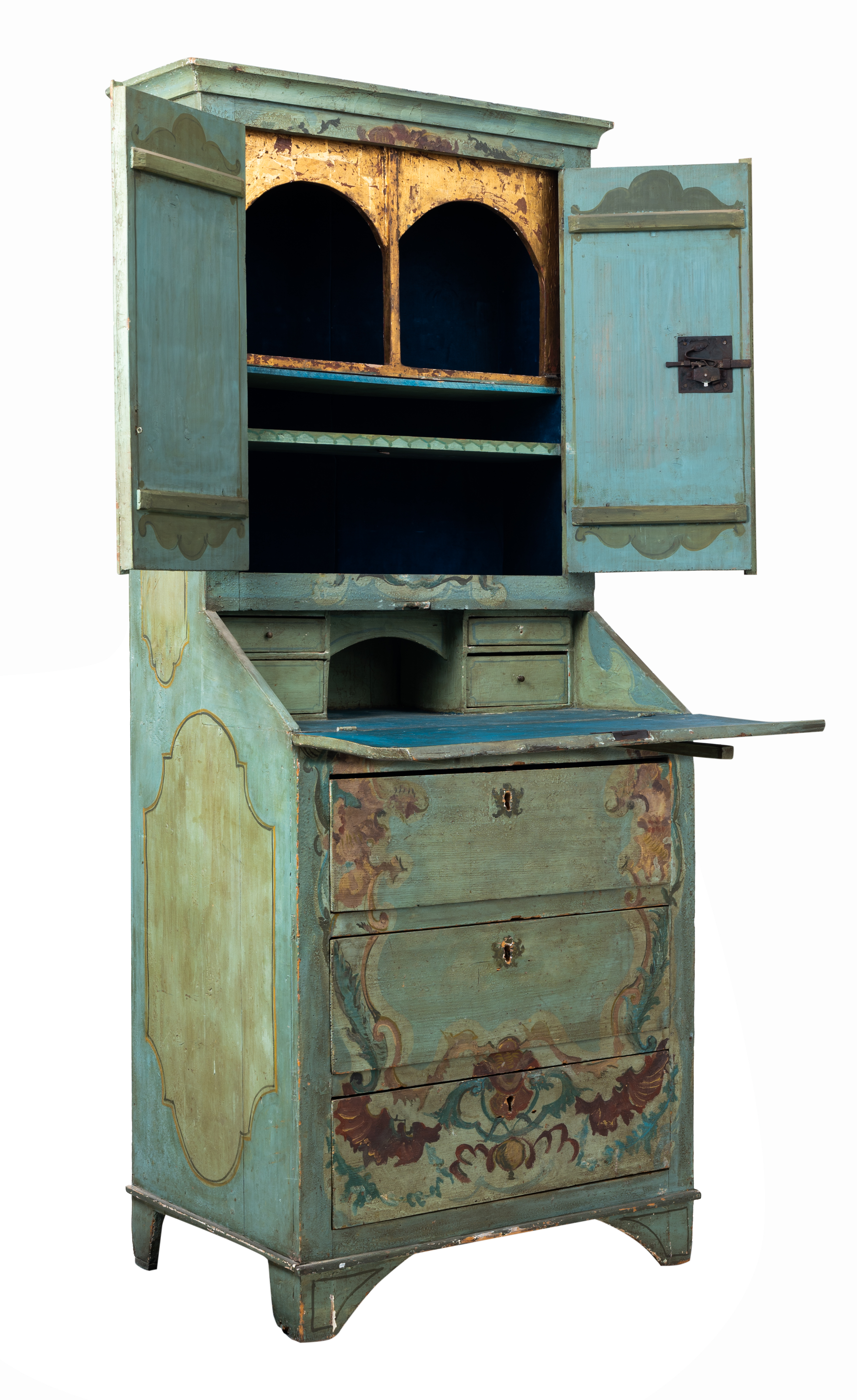 Trumeau con ribalta a due ante nella parte sovrastante e tre cassetti nella parte sottostante in legno laccato e decorato, laccatura e parte pittorica del XX secolo.