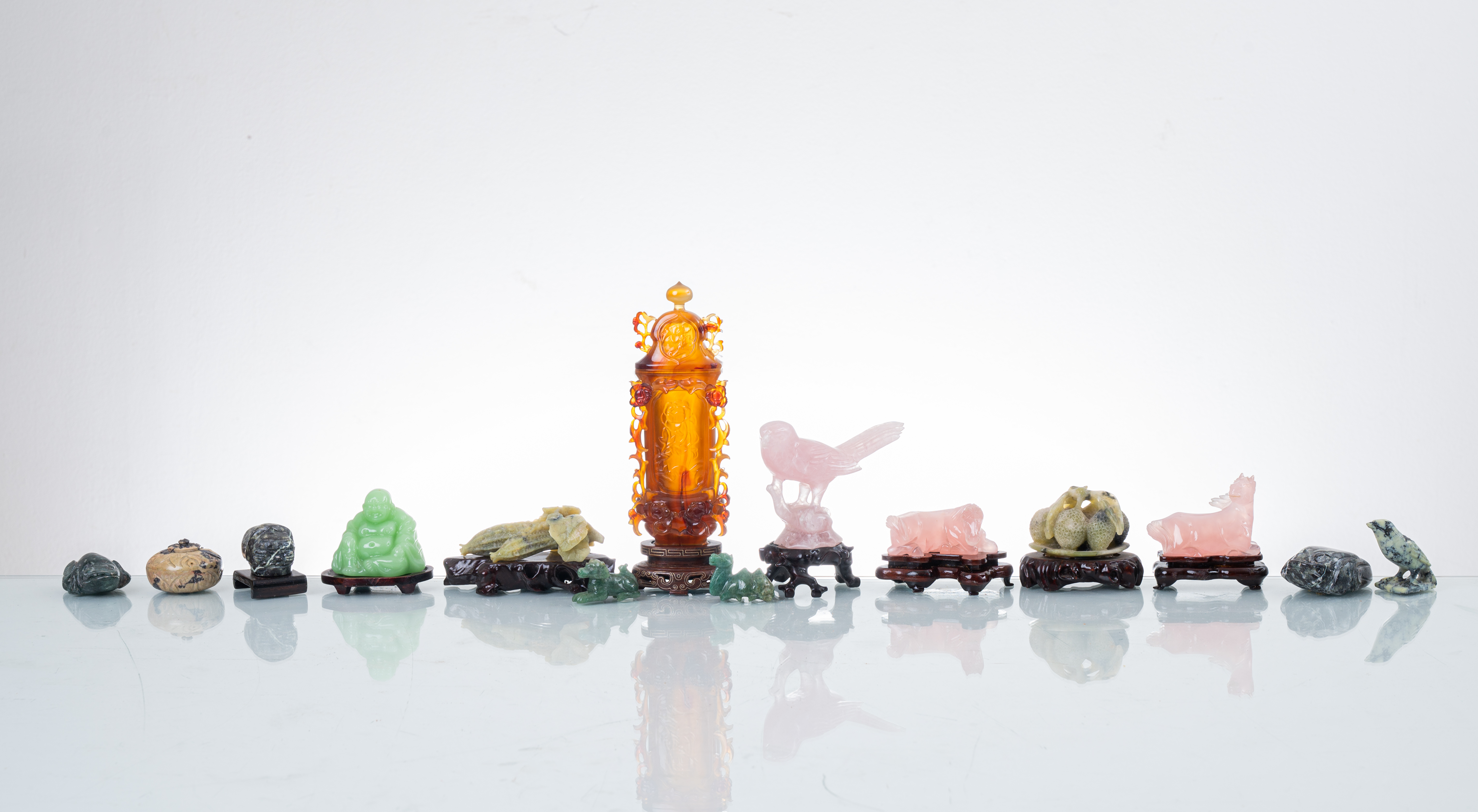 Collezione di sculture varie in quarzo rosa, giada, corniola e pietra saponaria (usure).