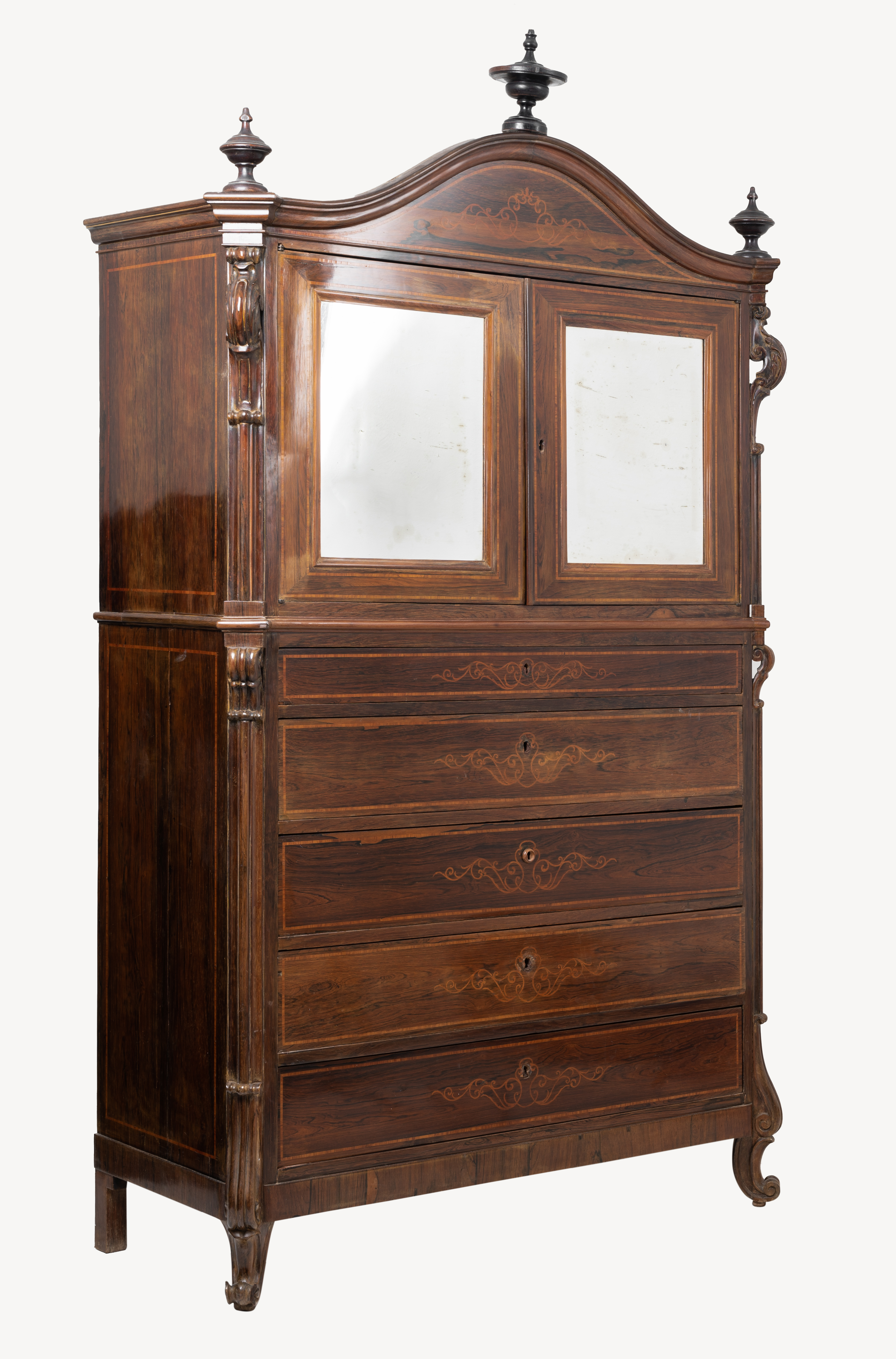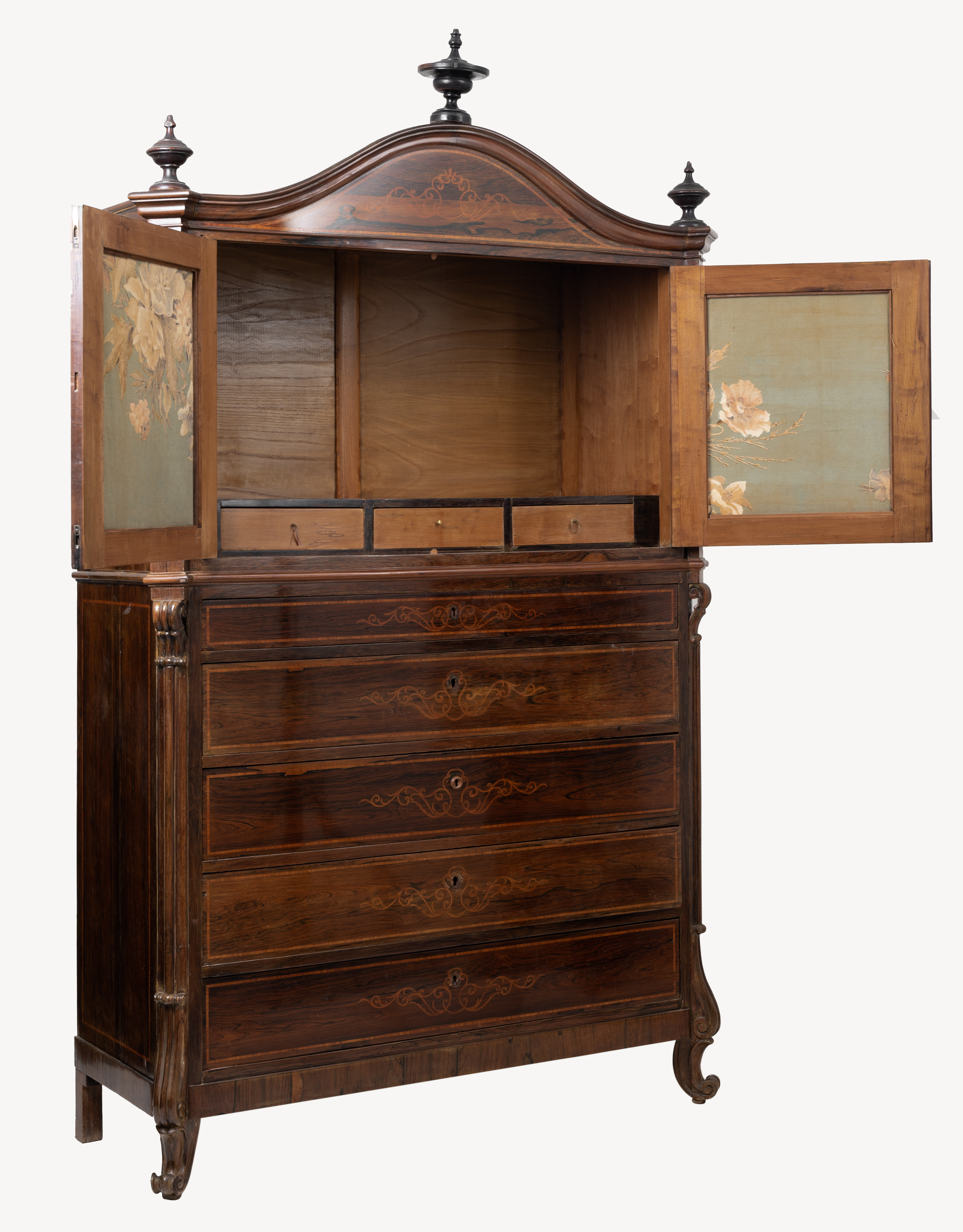 Chiffonier Luigi Filippo in legno esotico, con due ante nella parte sovrastante e cinque cassetti nella parte sottostante, filettature in bois de rose.