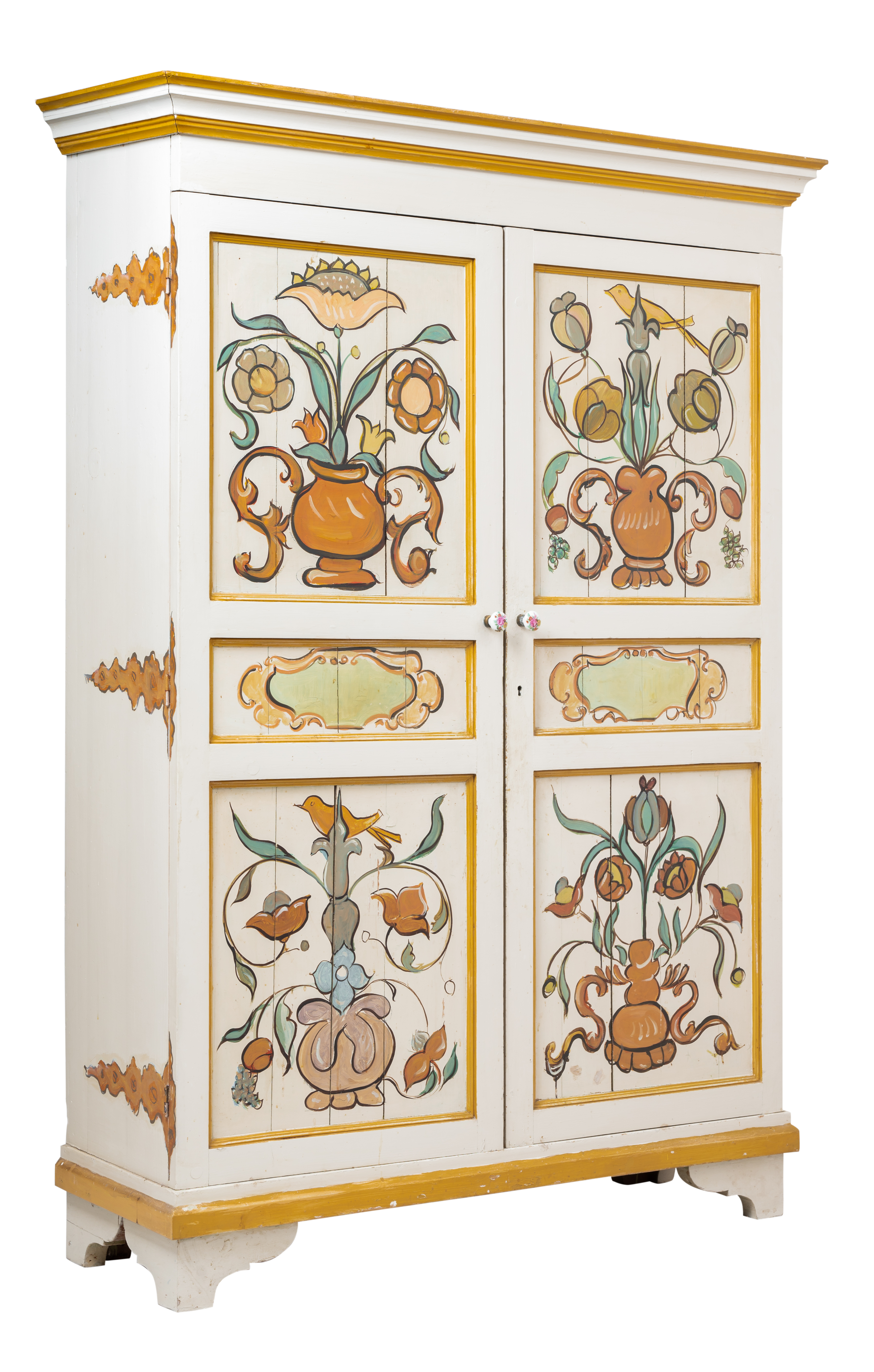 Stipo a due ante con laccature e parte pittorica del XX secolo.