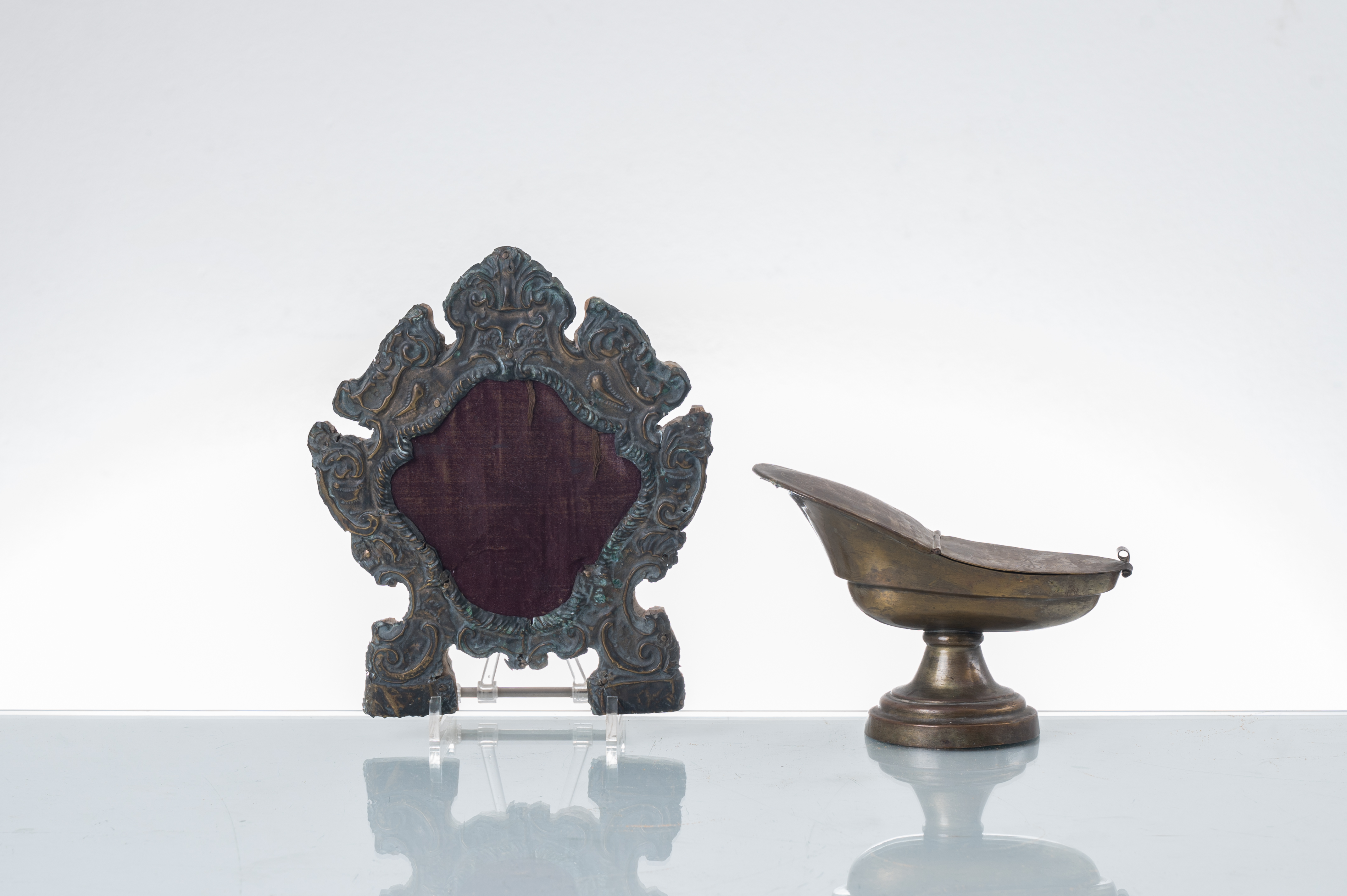 Cartagloria in legno rivestita in metallo sbalzato a mano e navetta in metallo.