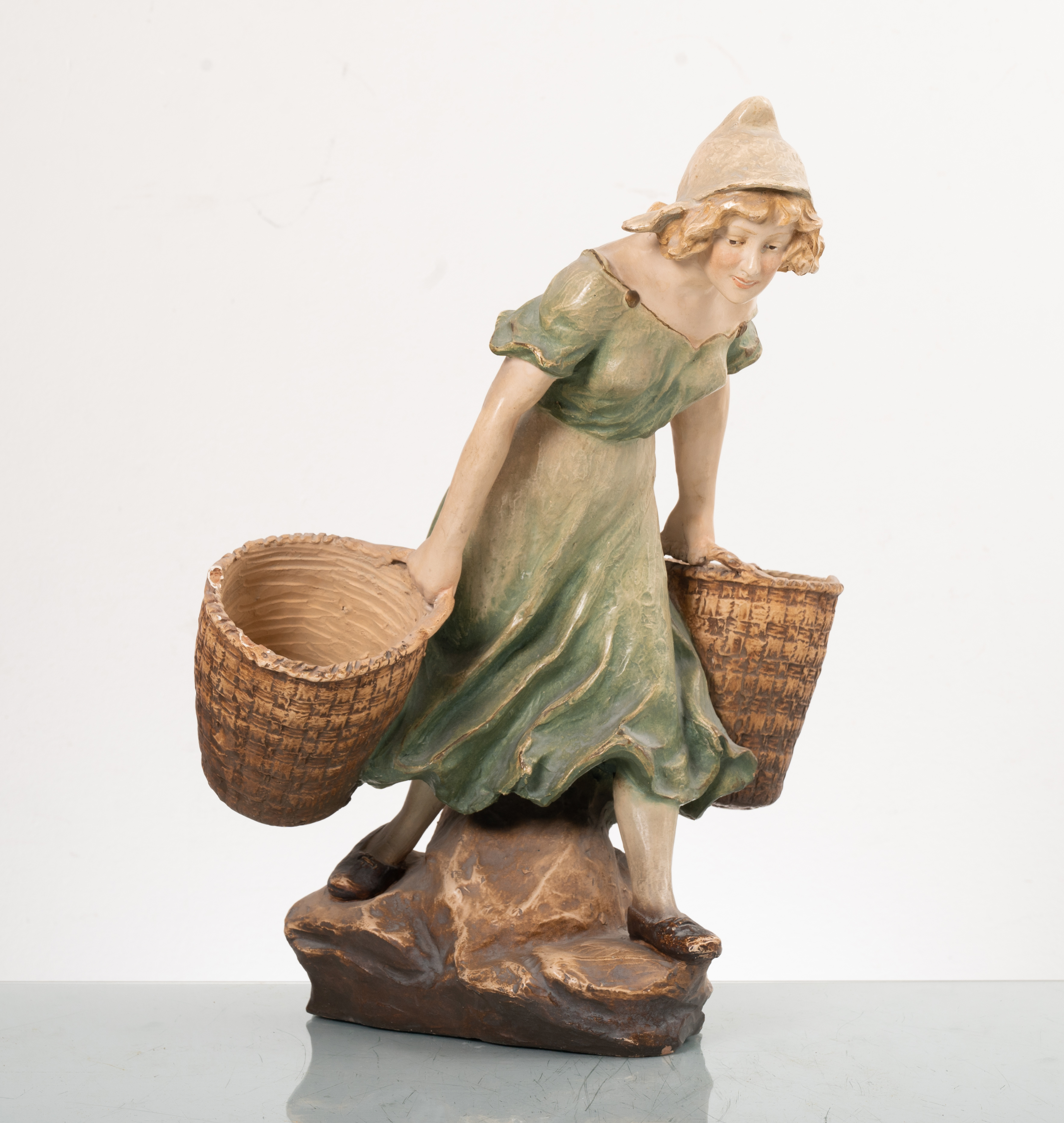 Scultura in terracotta policroma raffigurante "Ragazza con cesta", firma nel retro (filature e mancanze).