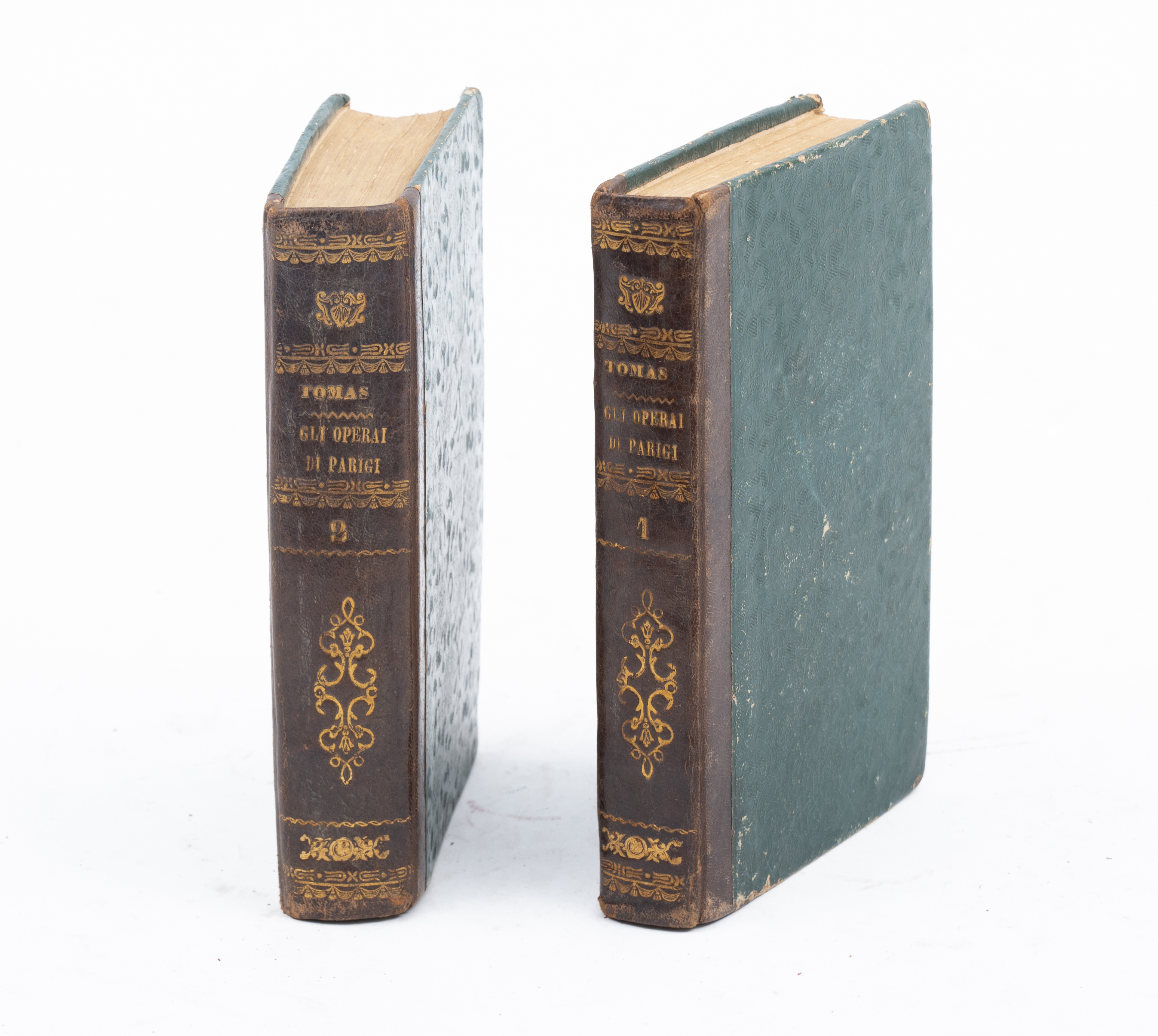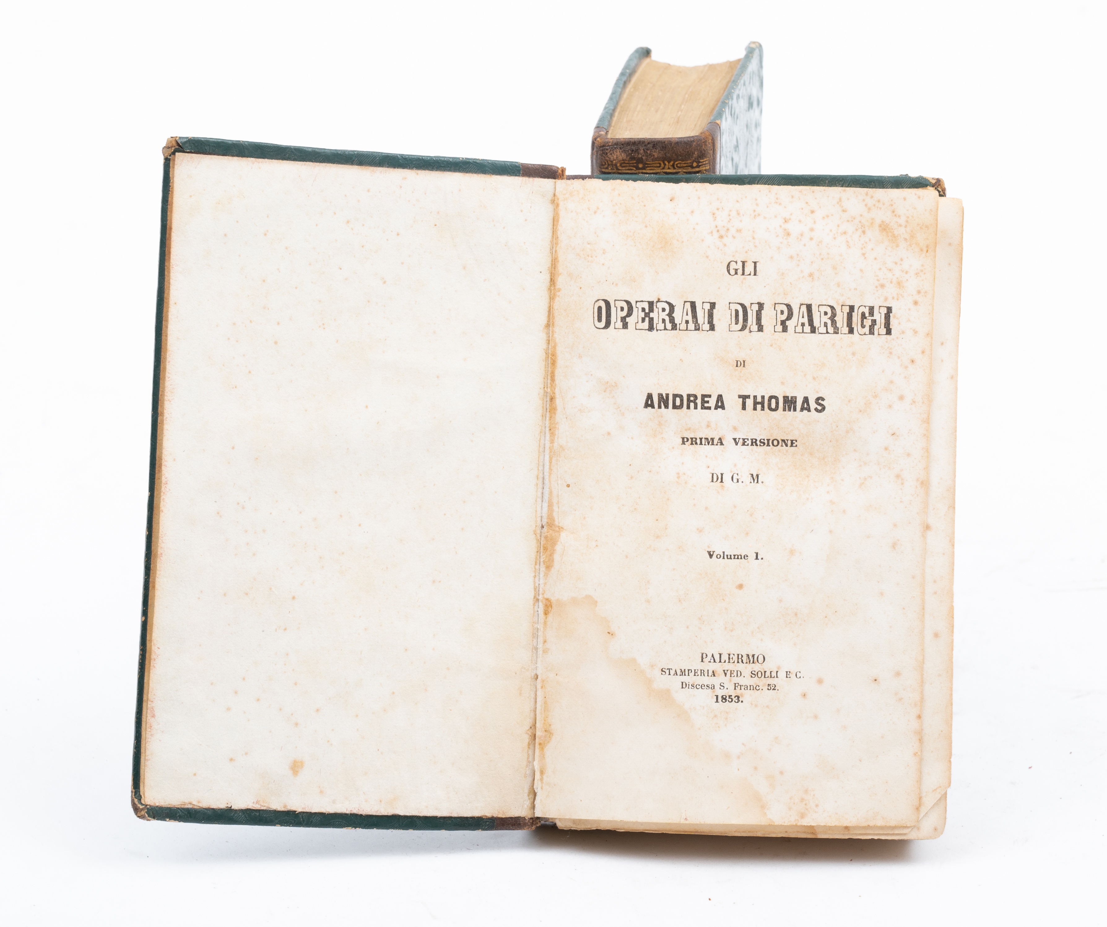 DUE VOLUMI di Andrea Thomas GLI OPERAI DI PARIGI, ed. Palermo Stamperia Ved. Solli 1853. Prima versione di G. M. In 2 volumi in 16° grande. Legature editoriale in mezza pelle con piatti marmorizzati. Raro a trovarsi. Pp. 367; 566.