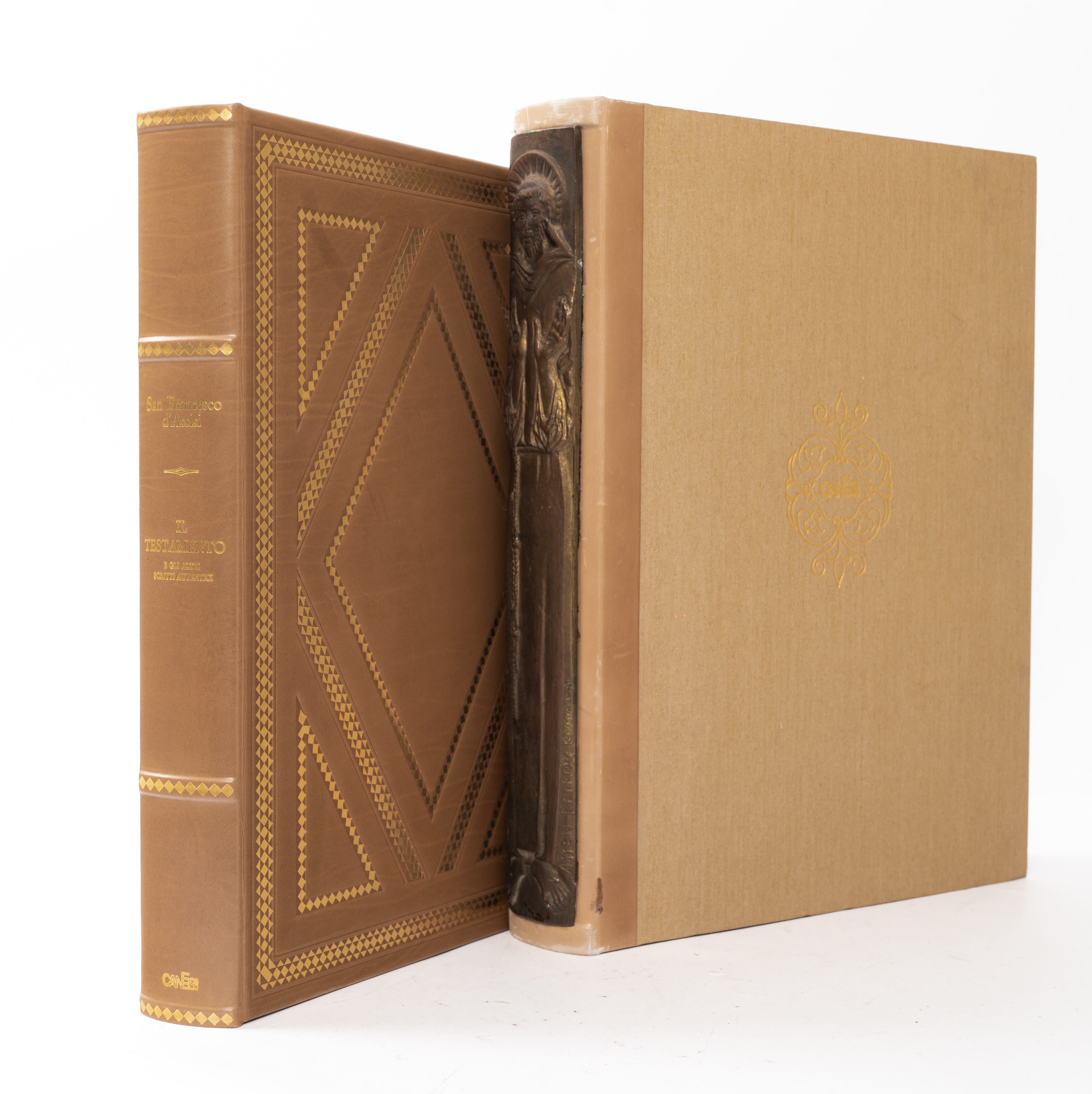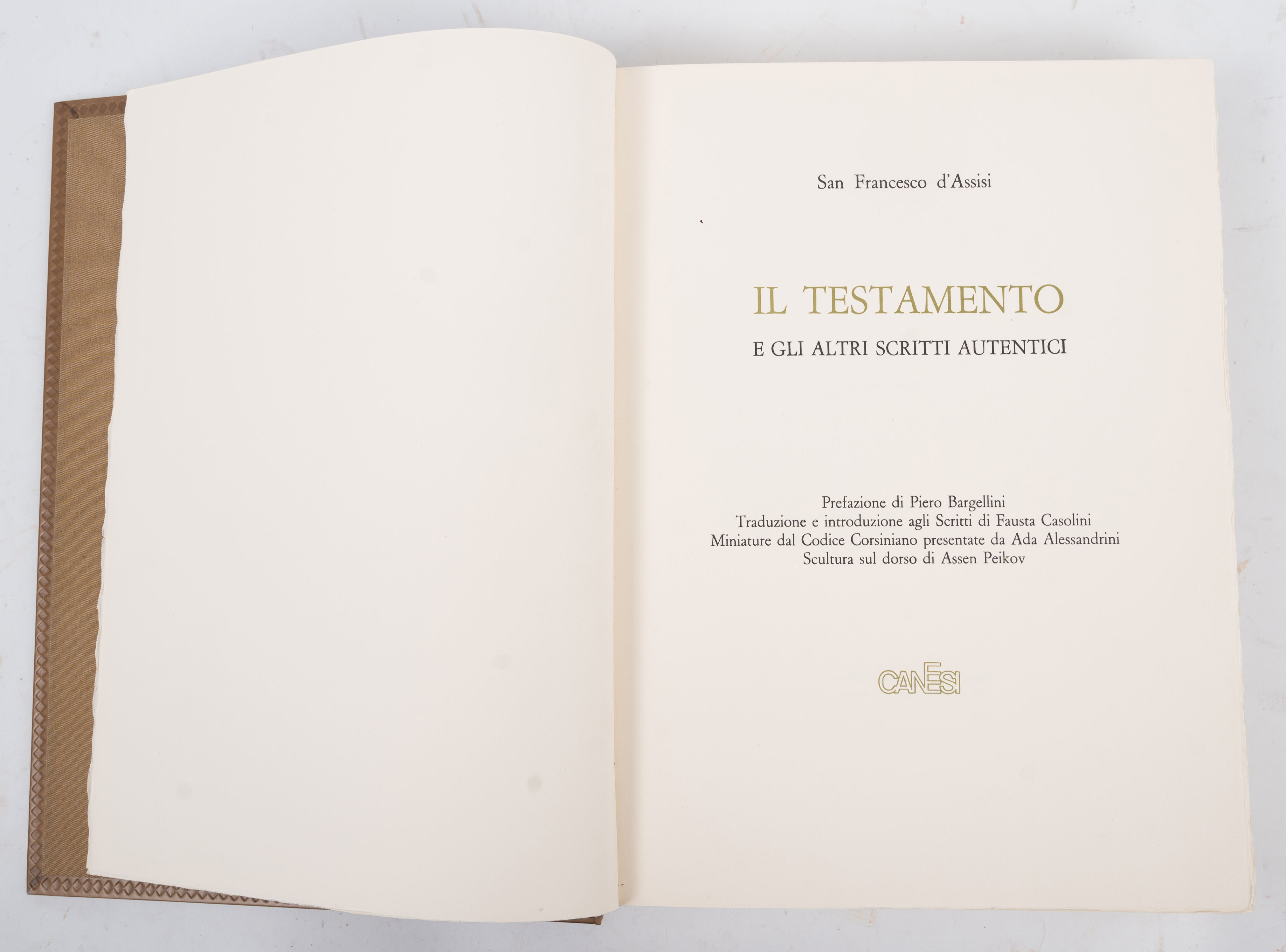 San Francesco d'Assisi IL TESTAMENTO E GLI ALTRI SCRITTI AUTENTICI, ed. Roma, Canesi, 1968. Formato cm 39x29. Opera curata da Nanni Canesi e Agostino Ghilardi. Prefazione di Piero Bargellini. Impaginata da Adriano Zannino, stampa curata da Ernesto Mori e stampato da Tipolito Nuova STEP di Parma. Legatura d'arte Giovanni Codina di Milano in piena pelle. Dorso a 4 nervi con titoli e fregi in oro. Sui due piatti in pelle è riprodotto un fregio tratto dall'ambone trecentesco della Basilica Inferiore di San Francesco in Assisi. Taglio superiore dorato. Stampato su carta filigranata appositamente fabbricata a mano, intonsa, dalla cartiera Ventura di Cernobbio. Selezione delle tavv. a colori e miniature della Foto-lito Kronos di Reggio Emilia dello Studio Fotografico Brucoli di Roma. Capilettera da un codice musicale del 1300 della Biblioteca Comunale di Assisi. Le miniature tratte dal Codice Corsiniano. Esemplare n° CCCXV dell'edizione speciale. Con cofanetto in mezza pelle con fregi in oro e scultura sul dorso di Assen Peikov raffigurante il Santo. Volume e cofanetto in condizioni pressoché perfette. pp. XXI, [2], 264, [15].