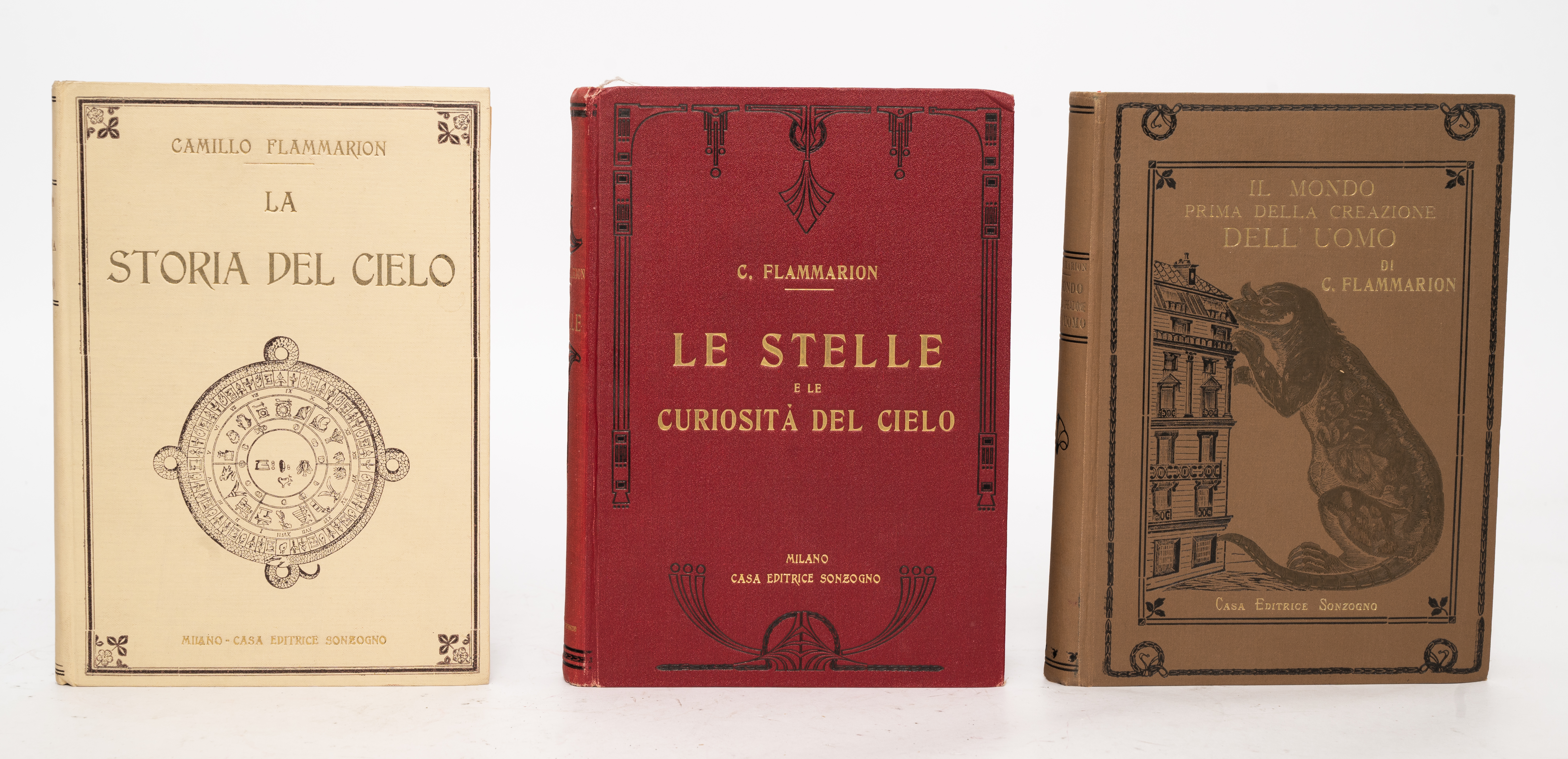 TRE VOLUMI DI CAMILLO FLAMMARION: 1) LE STELLE E LE CURIOSITA’ DEL CIELO, ed. Milano Sonzogno 1927. In 8° grande. Volume in ottime condizioni. Legatura editoriale con impressioni a secco e in oro. Con 400 figure, carte celesti, tavole e cromolitografie. Leggerissime bruniture del tempo, ma volume in ottime condizioni. Pp. 848. 2) IL MONDO PRIMA DELLA CREAZIONE DELL’UOMO, ed. Sonzogno, Milano 1906. Traduzione con note del dott. Diego Sant’Ambrogio. Legatura editoriale con impressioni a secco e in oro. Illustrato da oltre 400 figure. Sporadiche fioriture. In ottime condizioni. Pp. 660. 3) LA STORIA DEL CIELO, ed. Sonzogno, Milano 1925. Nuova versione, revisione, note e due indici analitici a cura di G. V. Callegari. Legatura editoriale in piena pelle rigida con titoli impressi in oro e disegno a secco al piatto. In ottime condizioni. Pp. 372.
