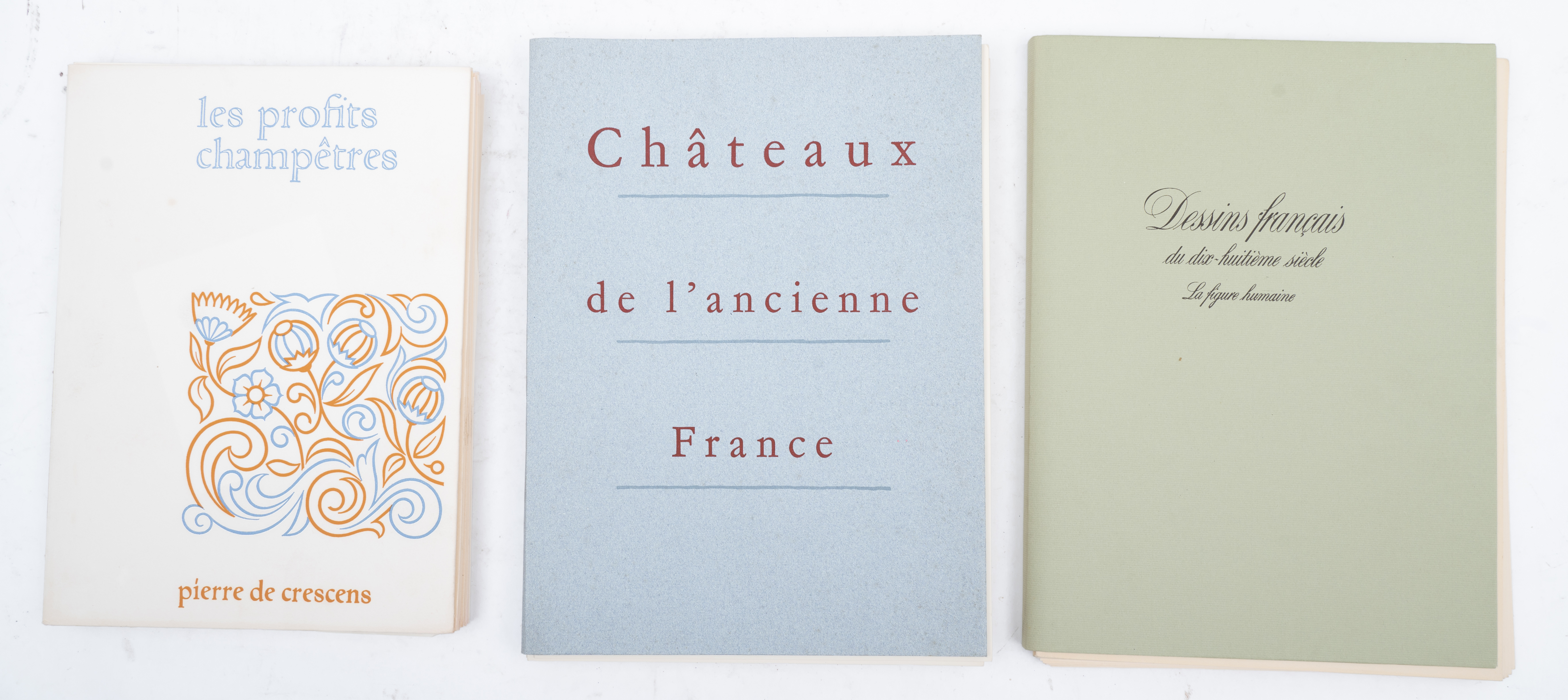TRE PUBBLICAZIONI IN LINGUA FRANCESE: 1) CHATEAUX DE L’ANCIENNE FRANCE, ed. Credit Lyonnais 1957. Prefazione di André Maurois In 4° . Scatola editoriale contenente 80 tavole sciolte non numerate; alcune applicate su cartoncino. 2) DESSIN FRANCAIS DU DIX-HUITIEME SIECLE, ed. Credit Lyonnais 1959. Testi di Gerard Bauer. In 4°. Scatola editoriale contenente VIII pagine a foglio e 32 tavole sciolte non numerate. 3) Pierre de Crescens LES PROFITS CHAMPETRES, ed. Credit Lyonnais 1965. In-4°. 84 pagine di testo, in brossura editoriale con sovraccoperta a risvolti con illustrazione floreale stilizzata bicroma. 12 tavole a colori f.t. su 'velin héliomat' delle Papeteries Arjomari riproducenti miniature medievali e protette da veline parlanti. Eccellente esemplare a fogli sciolti, entro custodia editoriale in piena tela rossa cangiante con titolo in oro. Prima edizione in francese moderno del più importante trattato agronomico del Medioevo. Riservata agli amici del Crédit Lyonnais.