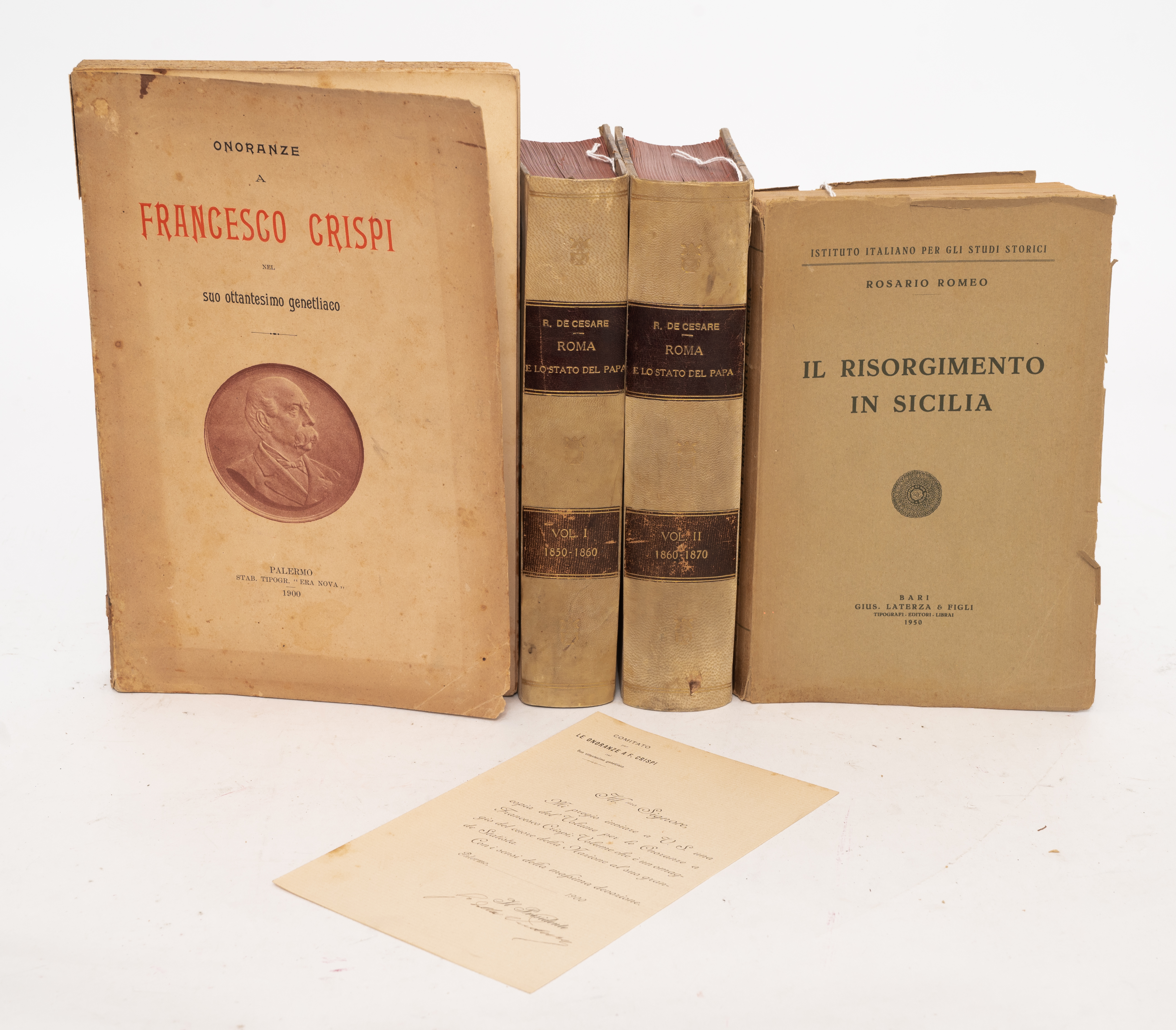 QUATTRO VOLUMI DI STORIA CON UNA LETTERA AUTOGRAFA: 1) ONORANZE A FRANCESCO CRISPI NEL SUO OTTANTESIMO GENETLIACO, ed. Palermo, Era Nova 1900. In 4°. Brossura editoriale figurata dal ritratto del Crispi tratto dalla medaglia realizzata in suo onore. Pagine ancora intonse. Testatine e capilettera artistici. Tavole f. t. il volume è accompagnato da lettera di invito autografa di Giulio Benso Duca della Verdura, allora Presidente della Società Siciliana per la Storia Patria. Pp. 389, (2). 2) Rosario Romeo IL RISORGIMENTO IN SICILIA, ed. Bari, Giuseppe Laterza e Figli 1950. In 8°. Brossura editoriale marginosa. Con 2 tavole più volte ripiegate f. t. Leggere bruniture del tempo ai tagli, ma volume in ottime condizioni. Pp. 422. 3) Raffaele De Cesare ROMA E LO STATO DEL PAPA. DAL RITORNO DI PIO IX AL XX SETTEMBRE, ed. Roma, Forzani 1907. In 2 volumi in 8°. Belle legature coeve in mezza pergamena con angoli e piatti marmorizzati. titoli e filetti in oro entro tasselli ai dorsi, con normali segni d’uso. Volumi con pagine in perfette condizioni. Pp. XII, 395; 489.