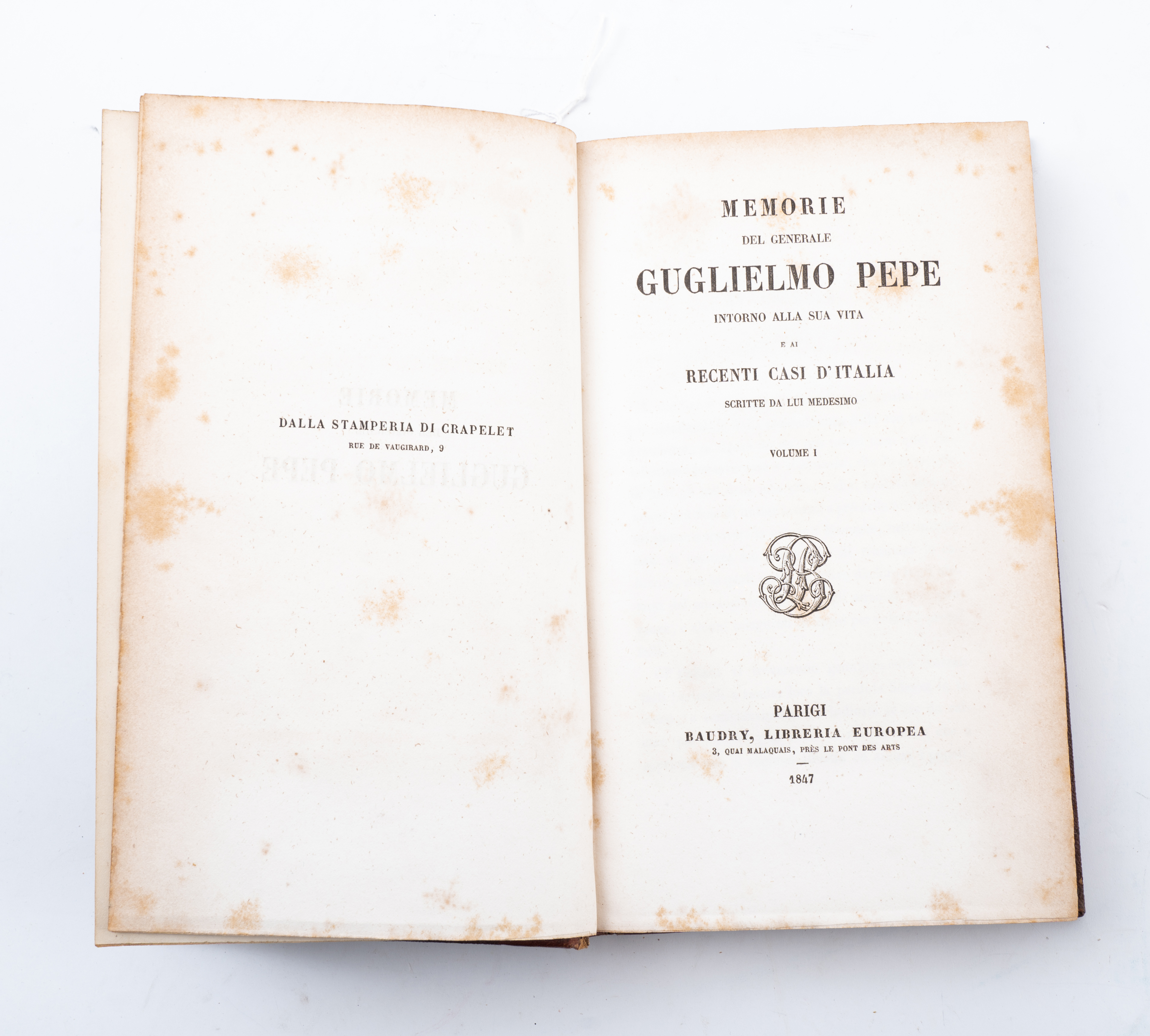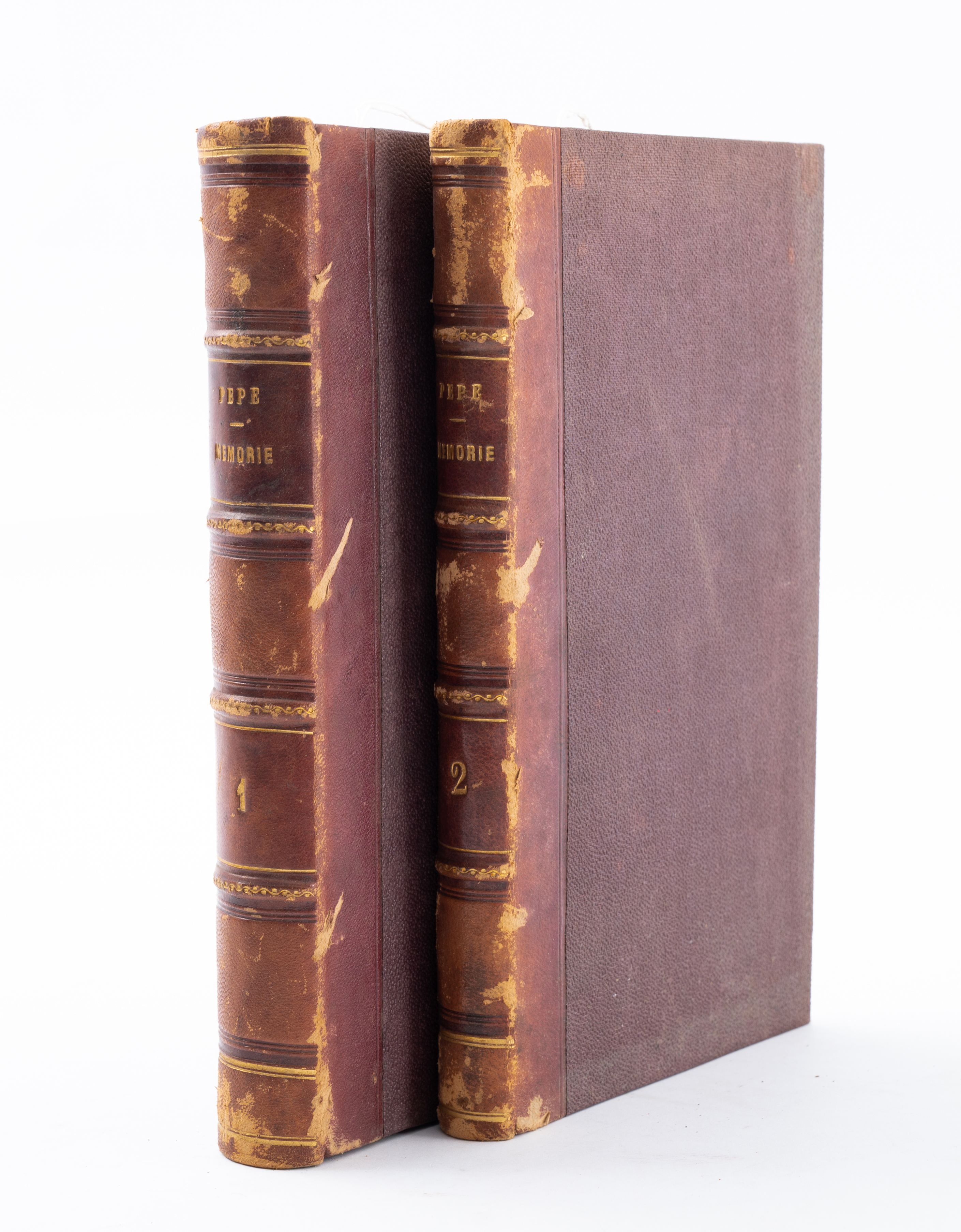 DUE VOLUMI DI MEMORIE EDITI NEL XIX SECOLO: Guglielmo Pepe MEMORIE DEL GENERALE GUGLIELMO PEPE INTORNO ALLA SUA VITA E AI RECENTI CASI D’ITALIA SCRITTE DA LUI MEDESIMO, ed. Parigi, Baudry Libreria Europea 1847. In 2 volumi in 8°. Belle e robuste legature coeve in mezza pelle con piatti in tela rigida. Nervature decorate in oro ai dorsi e titoli e filetti in oro ai dorsi. Pp. VI, 490; 283.