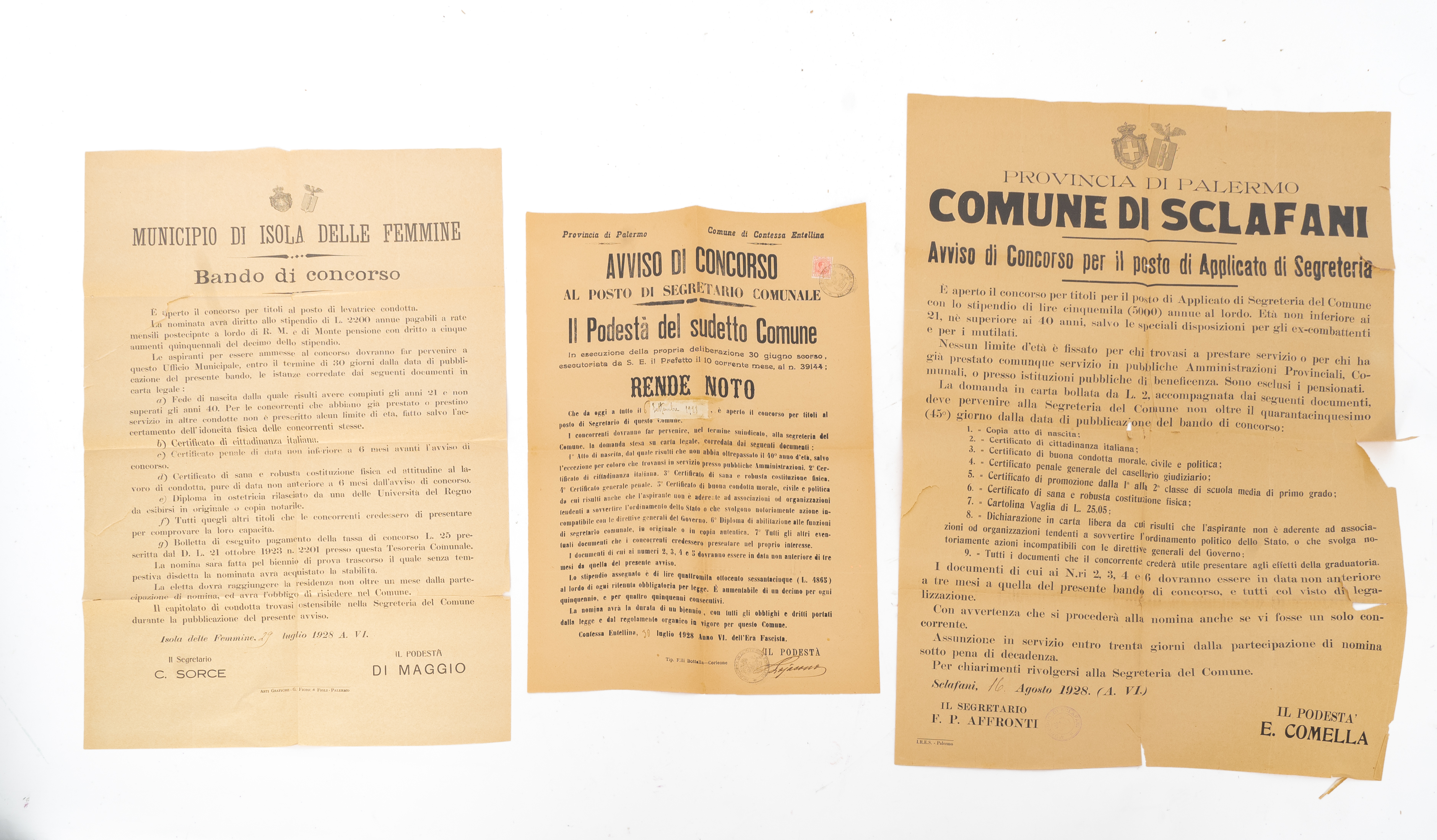 TRE AVVISI DI CONCORSO DEL 1928 DEI COMUNI DI CONTESSA ENTELLINA (PA), SCLAFANI (PA) E ISOLA DELLE FEMMINA (PA).