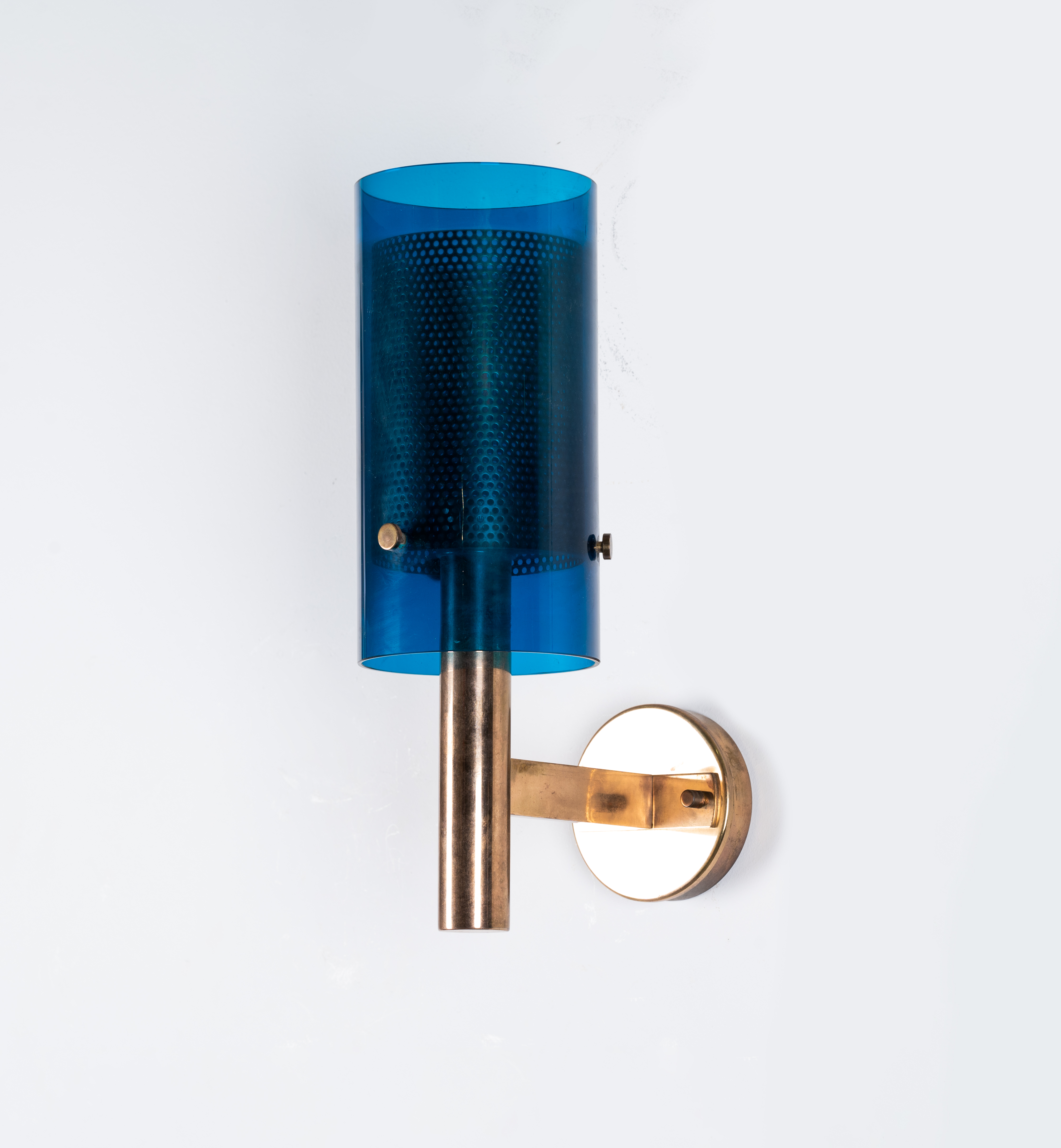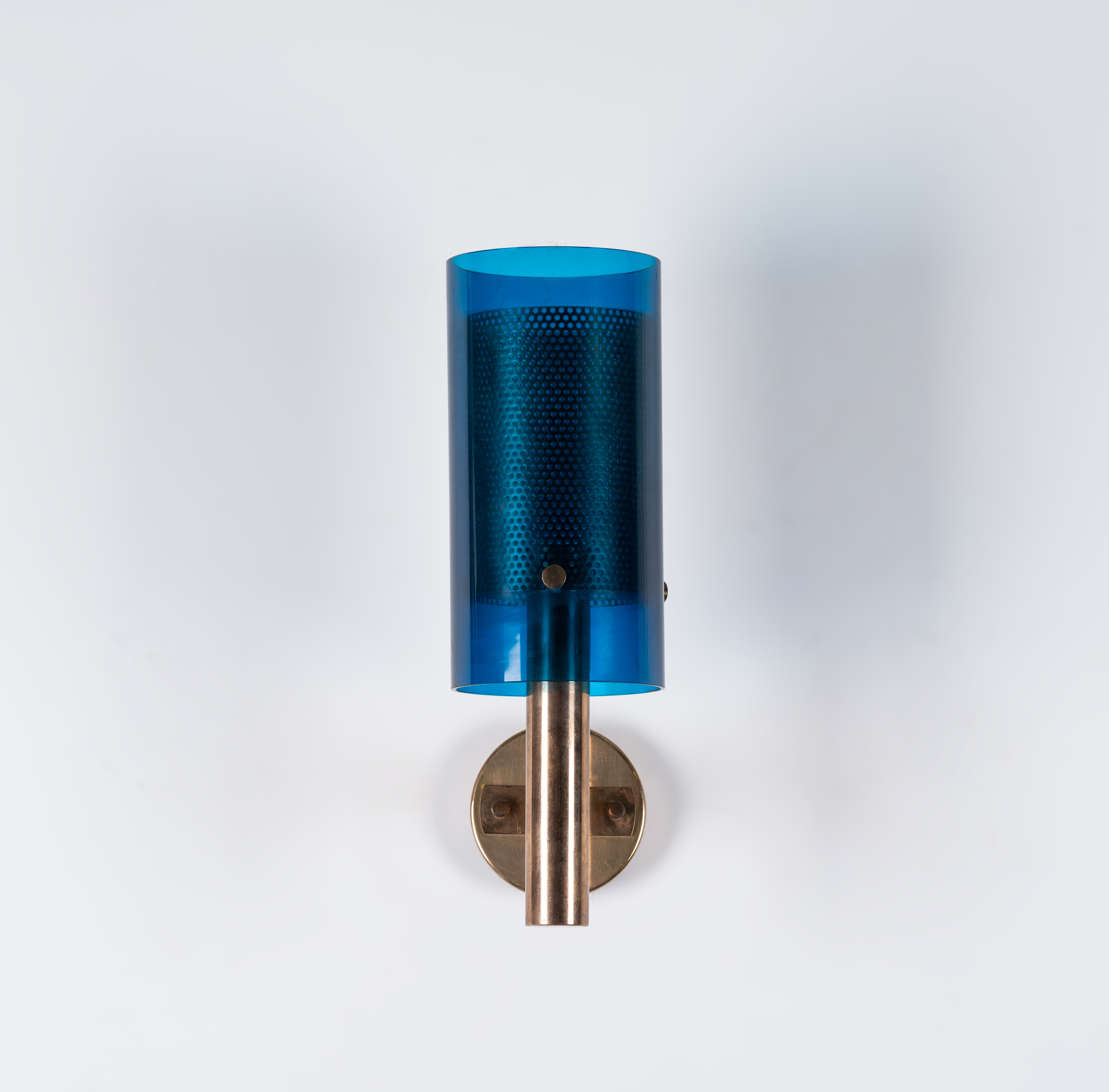 Lampada da parete ad una luce, struttura in ottone con diffusore cilindrico in vetro blu e metallo microforato.