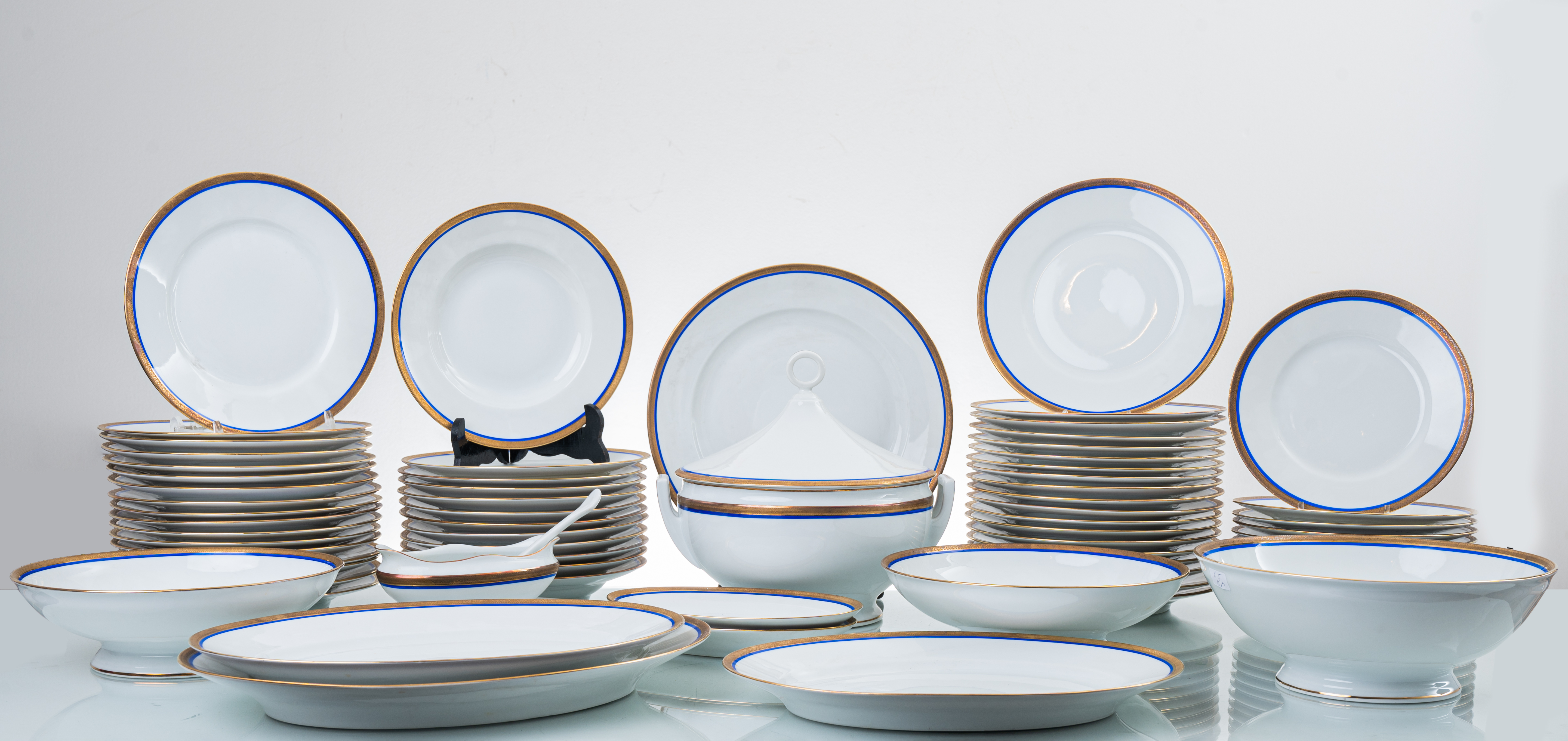 Servizio di piatti in porcellana bianca con decori e lumeggiature in oro composto da: zuppiera, 2 fruttiere, insalatiera, piatto da portata rotondo, 3 piatti da portata ovali, 2 raviere, salsiera con cucchiaio, 36 piatti piani, 12 piatti fondi, 12 piattini e 6 tazzine da caffè con piattini.