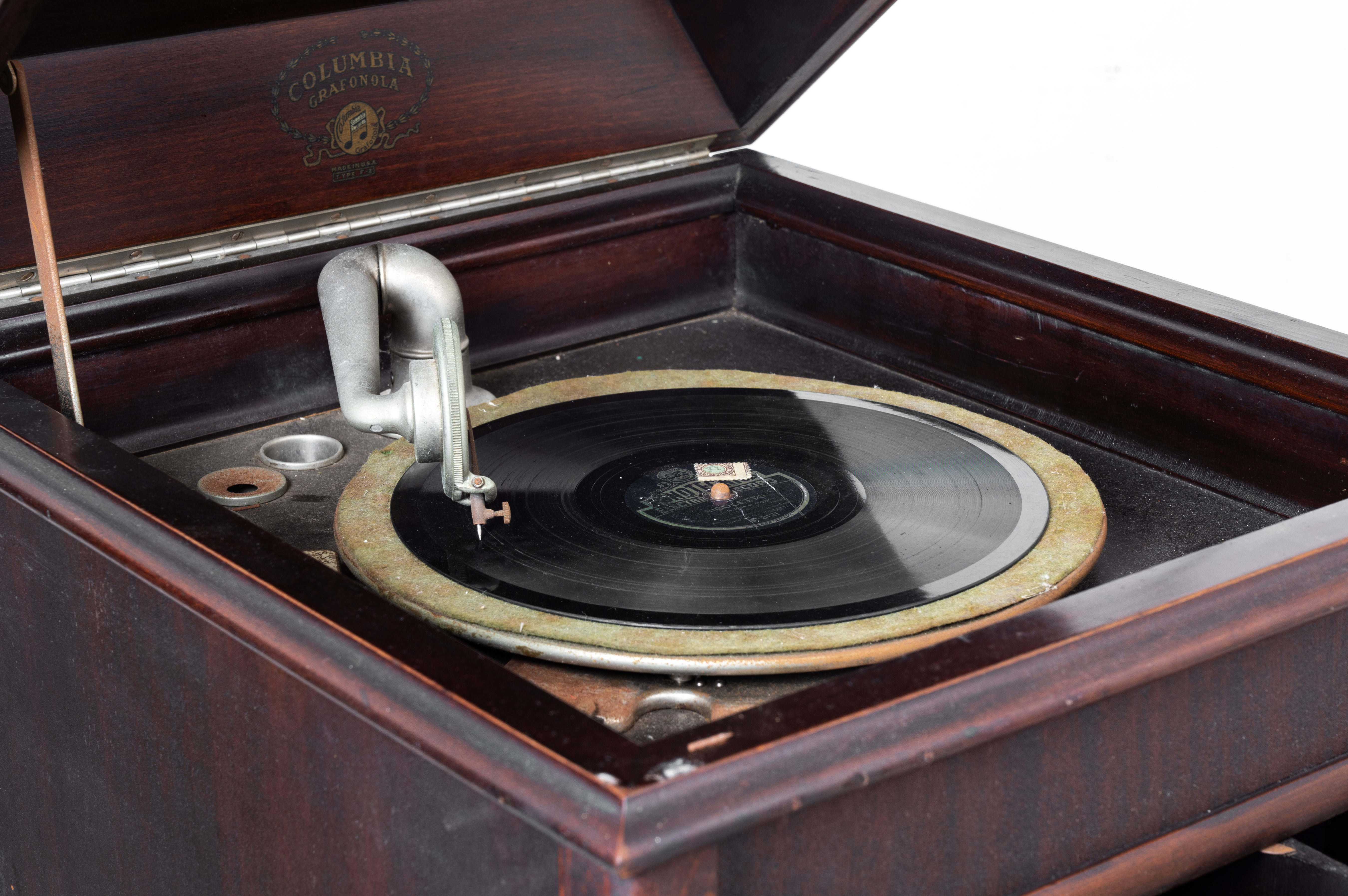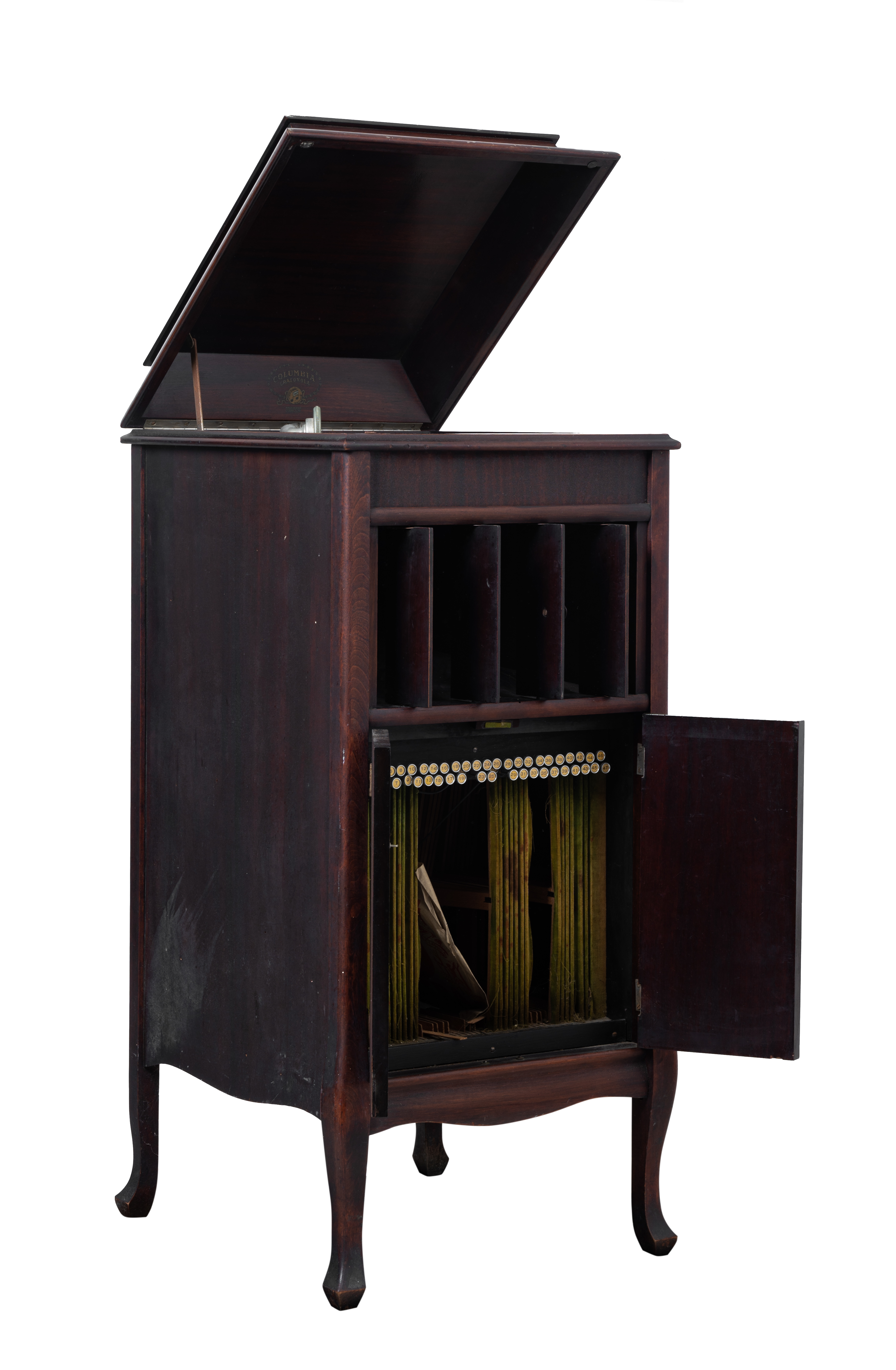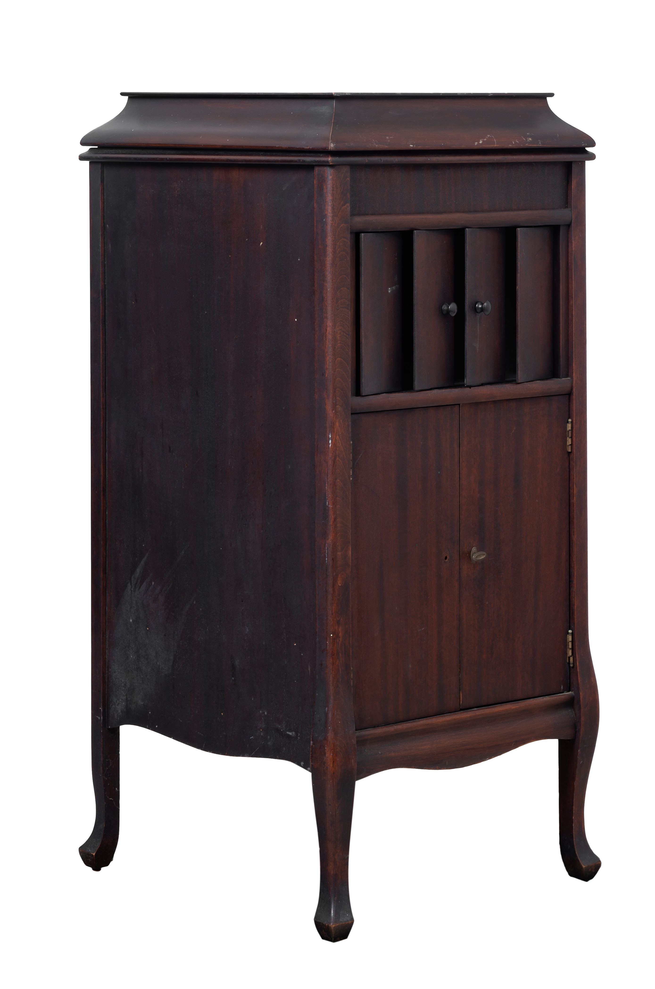 Mobile grammofono "Columbia Grafonola" in legno di mogano con sportello portadischi.