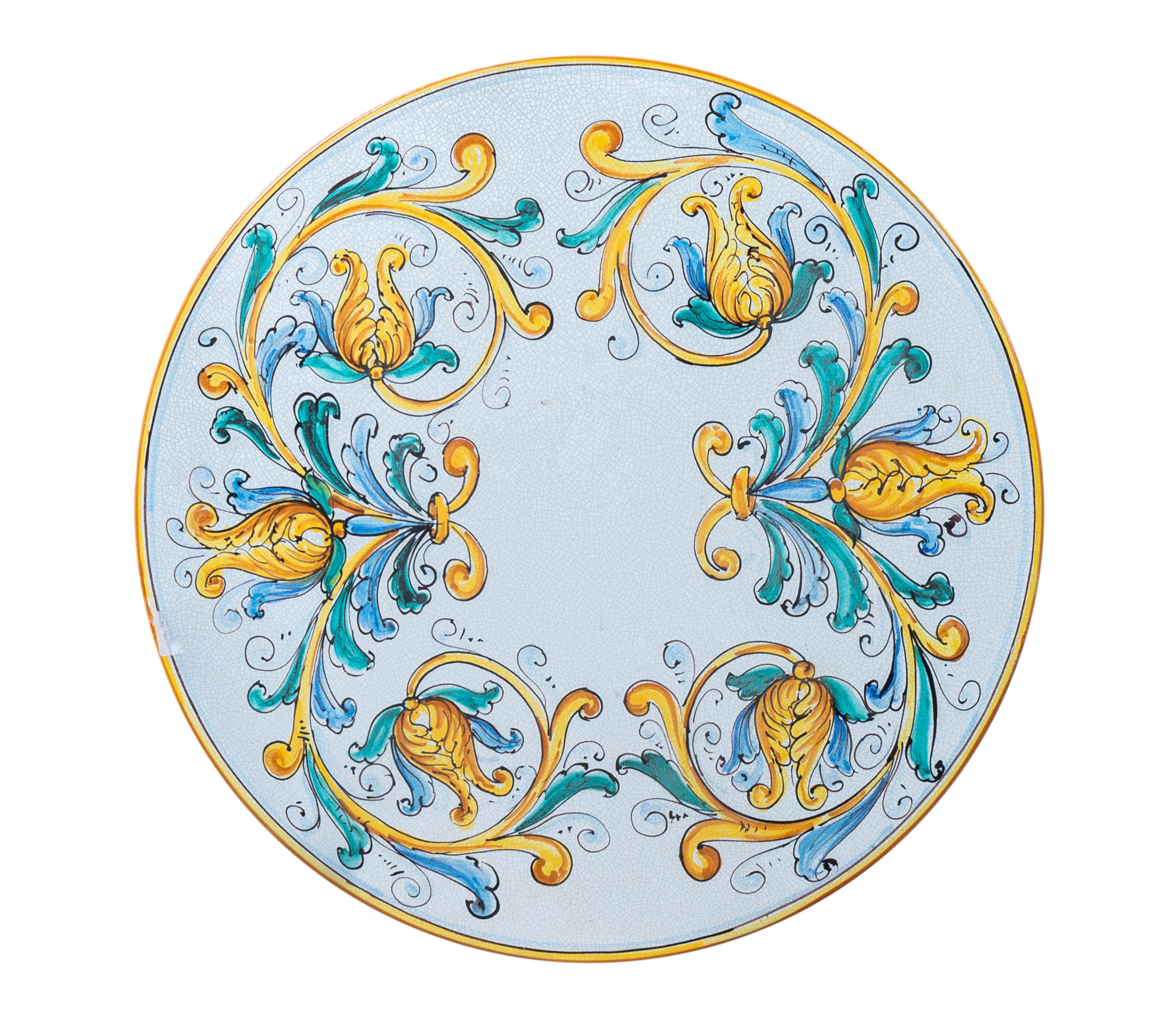 Tavolino con piano in ceramica smaltata e decorata, base in ferro.