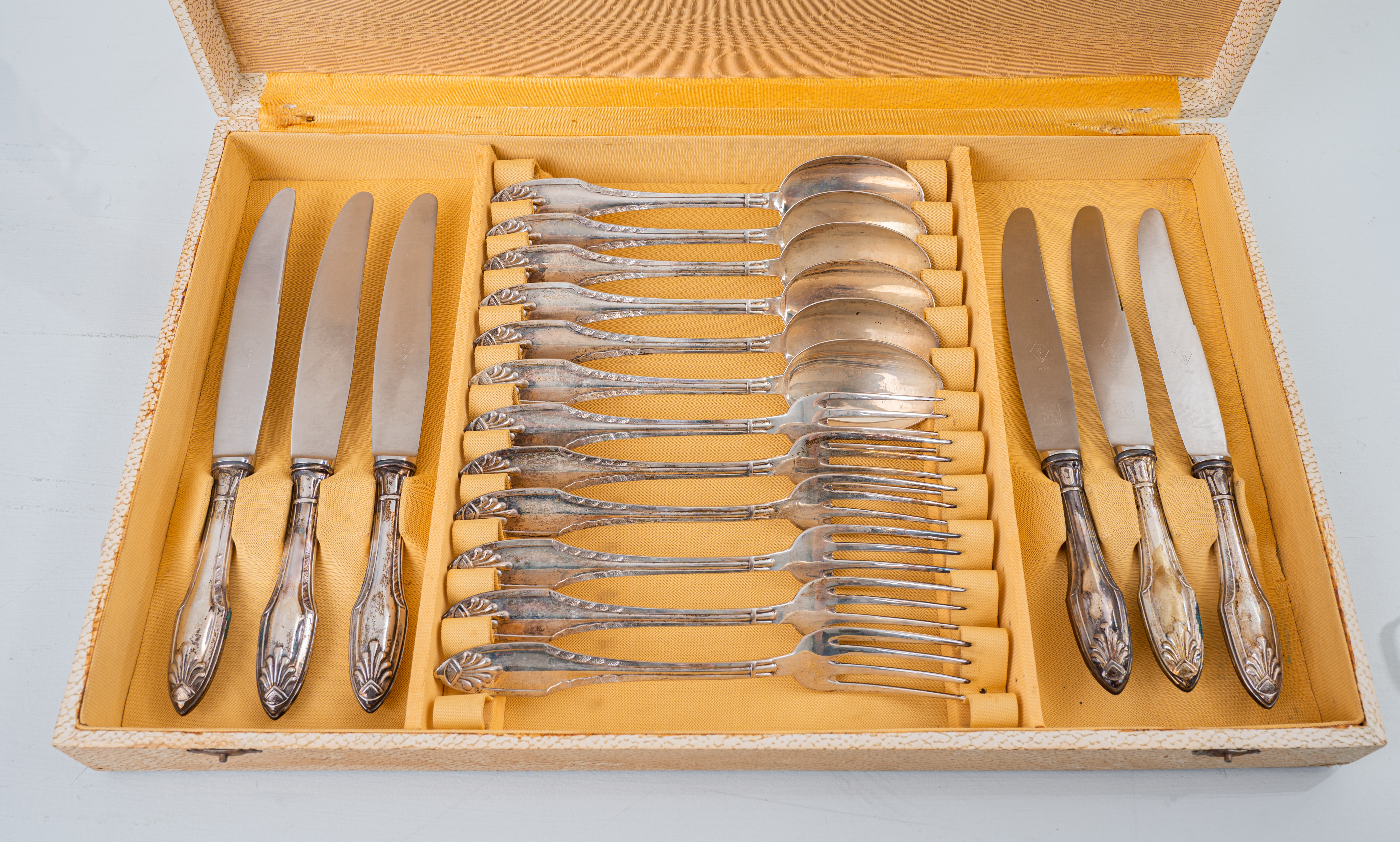 Cofanetto contenente servizio di posate in argento composto da: 6 cucchiai, 6 forchette e 6 coltelli.