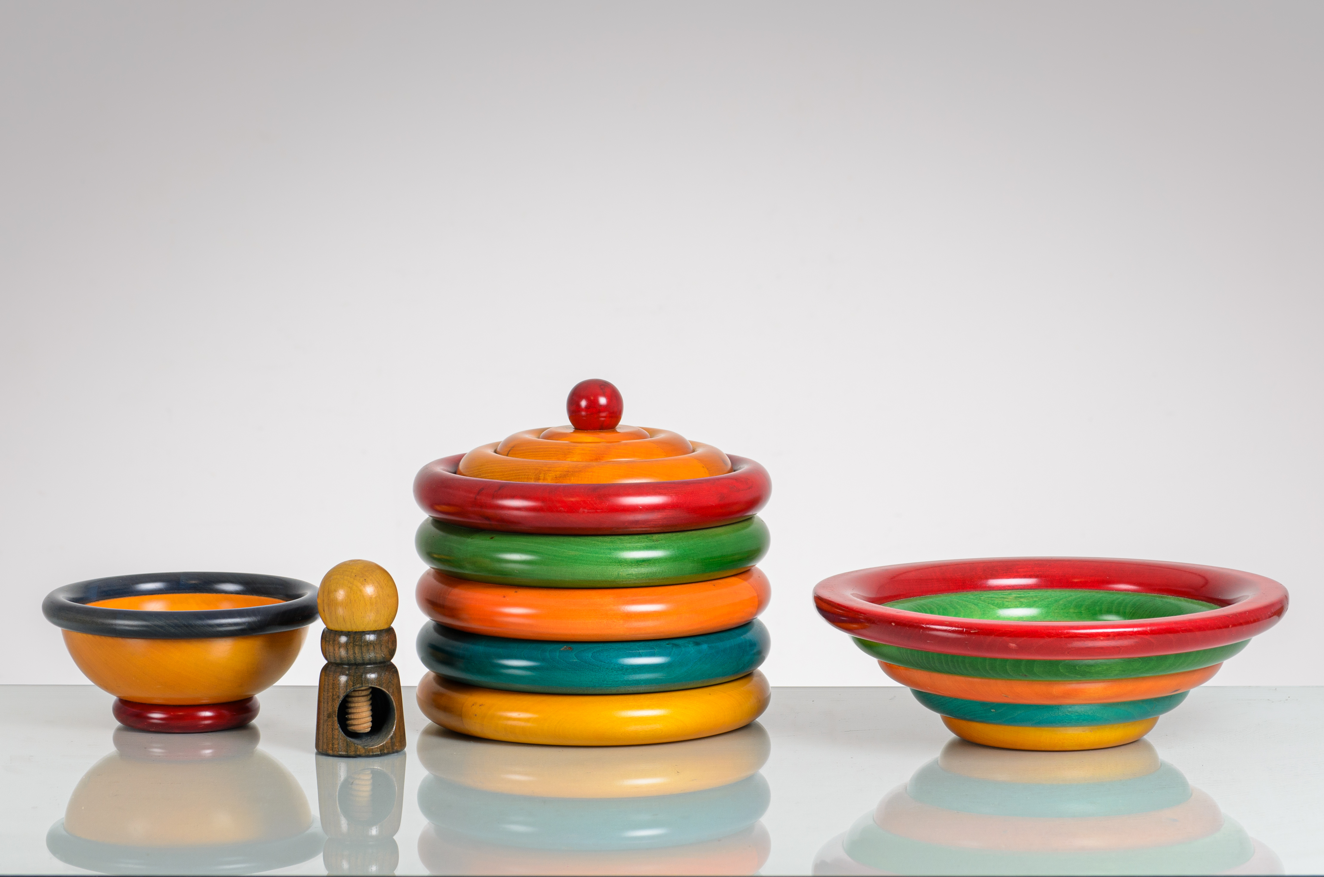 Quattro oggetti in legno colorato, un portaghiaccio con coperchio, due ciotole ed uno schiaccianoci. Marchio di produzione.