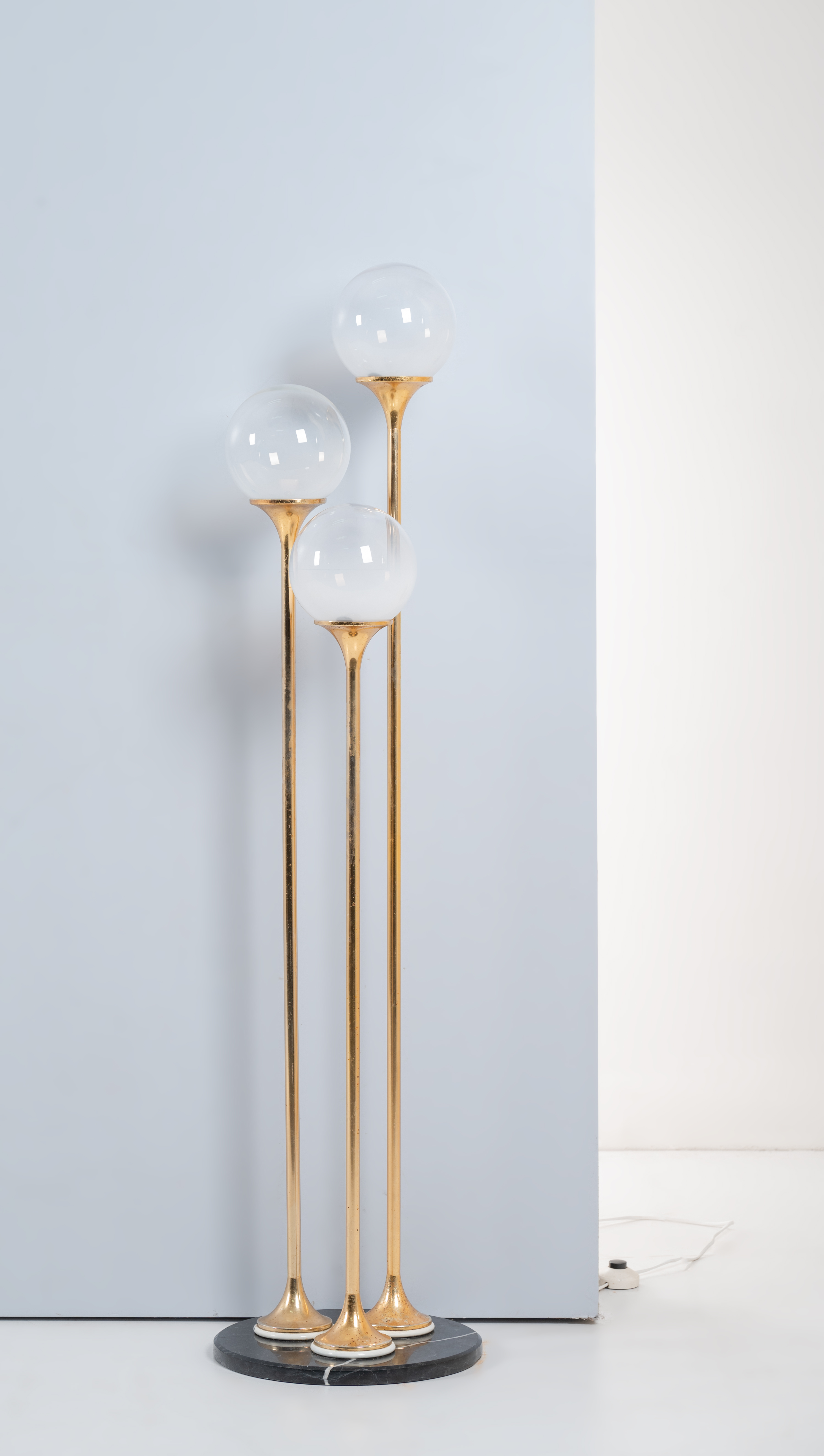 Lampada da terra a tre luci, struttura in metallo dorato, diffusori sferici in vetro parzialmente trasparente e opalino, base circolare in marmo nero, impianto elettrico originale.