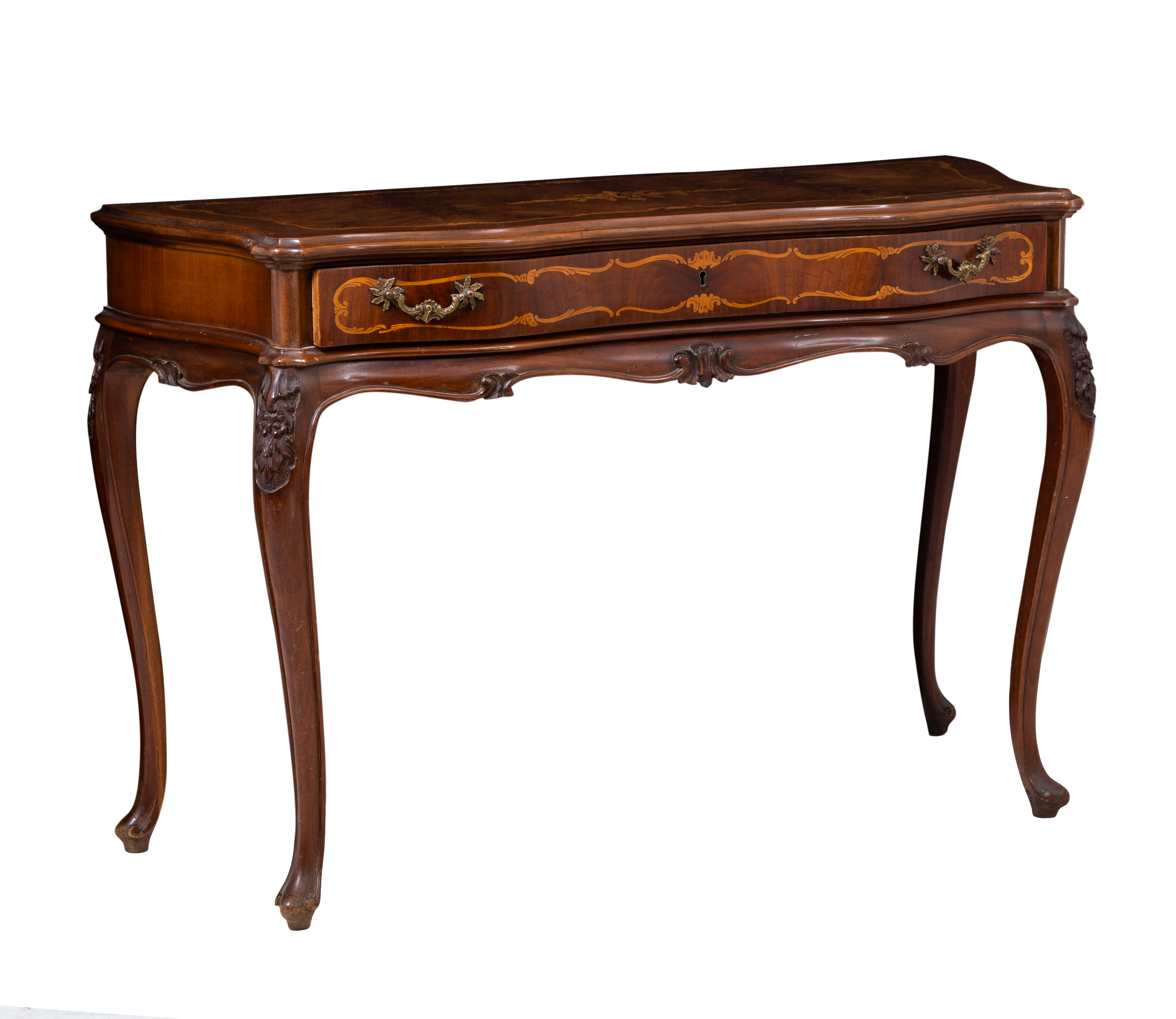 Piccola consolle di gusto barocco in legno di mogano e piuma di mogano, tarsie in bosso, cassetto centrale.