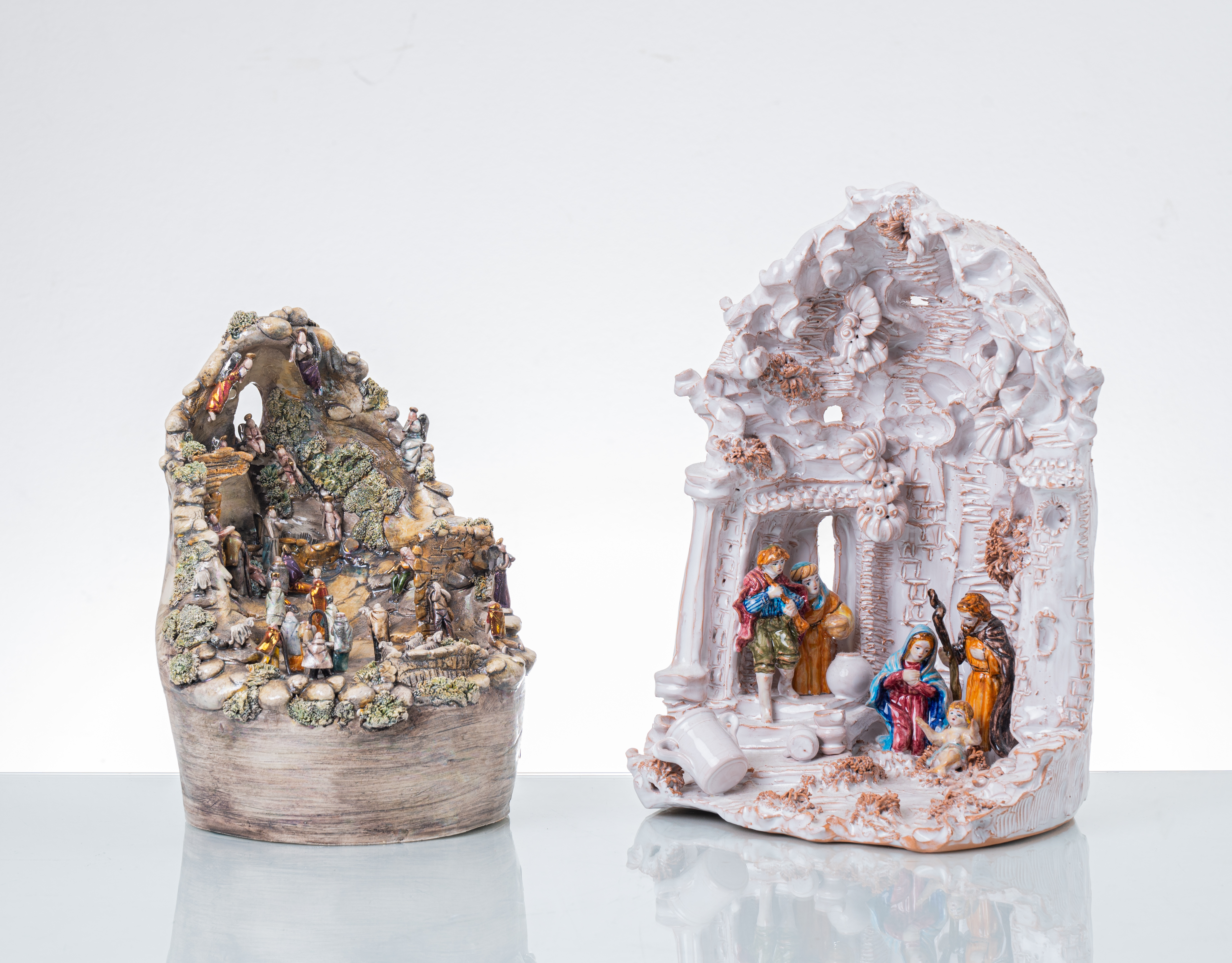 Due composizioni in ceramica smaltata e decorata raffiguranti "Presepe" (usure).