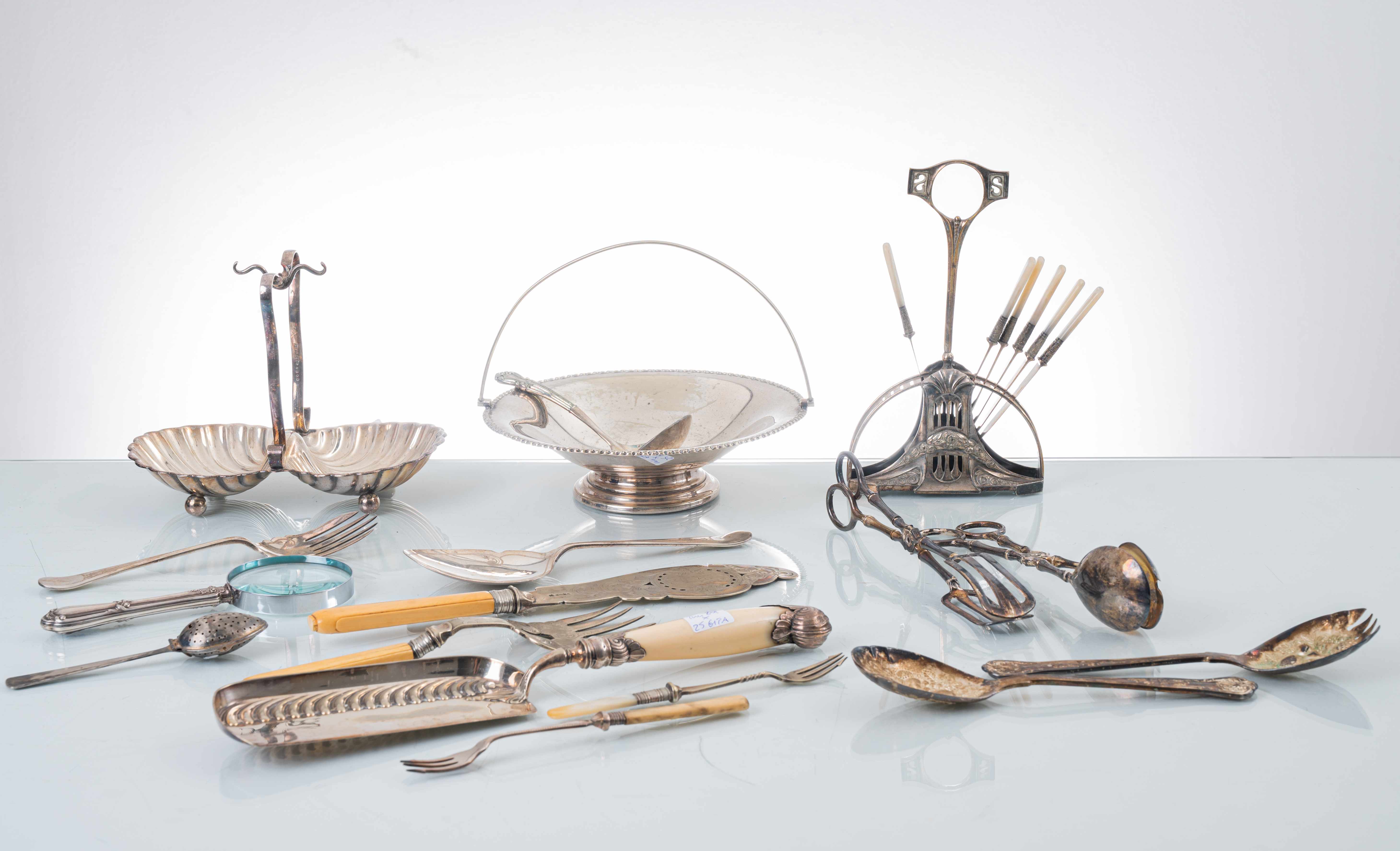 Diciassette oggetti vari da tavolo in sheffield, alcuni dei quali con manici in osso.