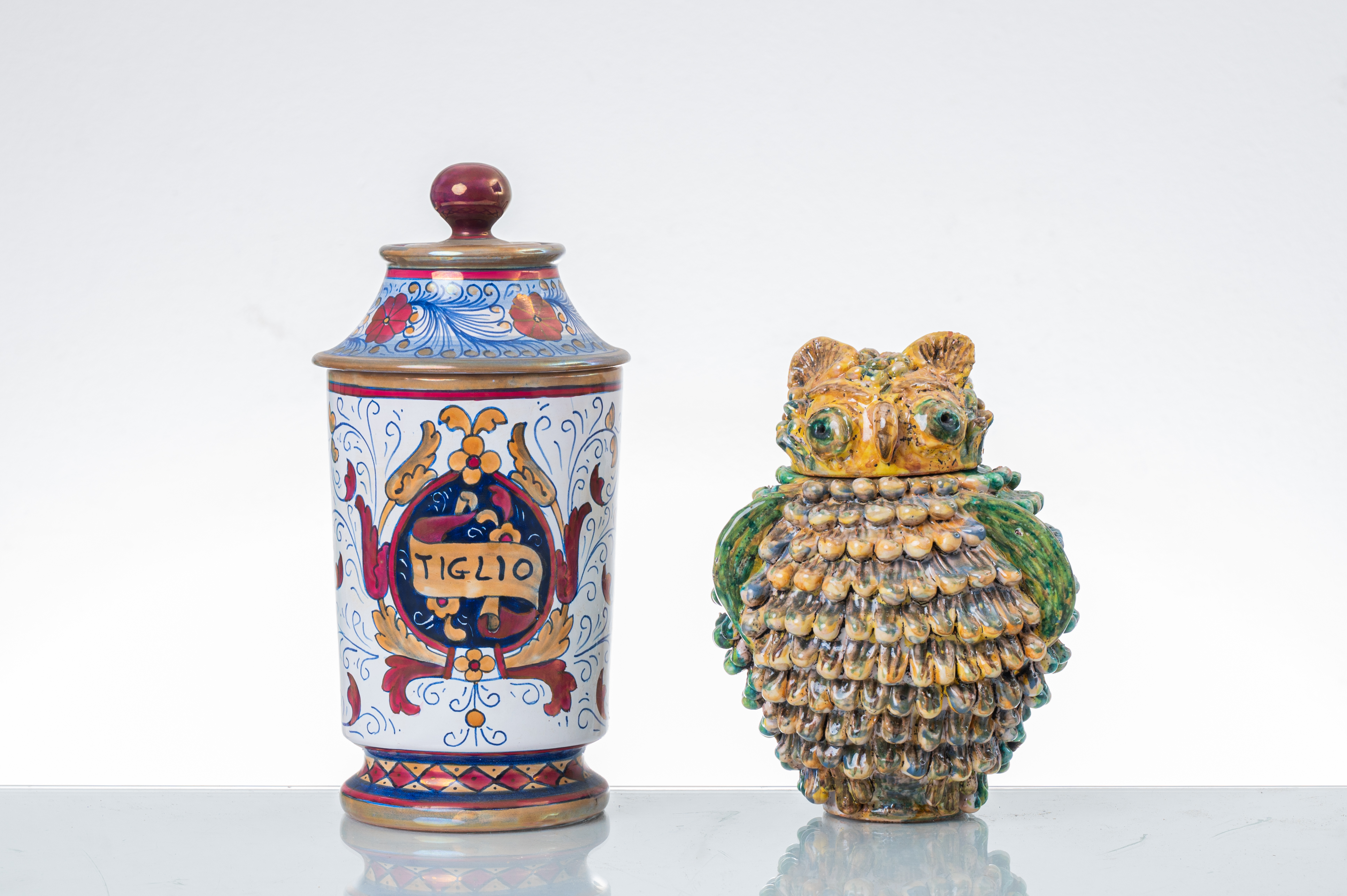 Vaso da farmacia ed un vaso a forma di gufo in ceramica smaltata e decorata (usure).