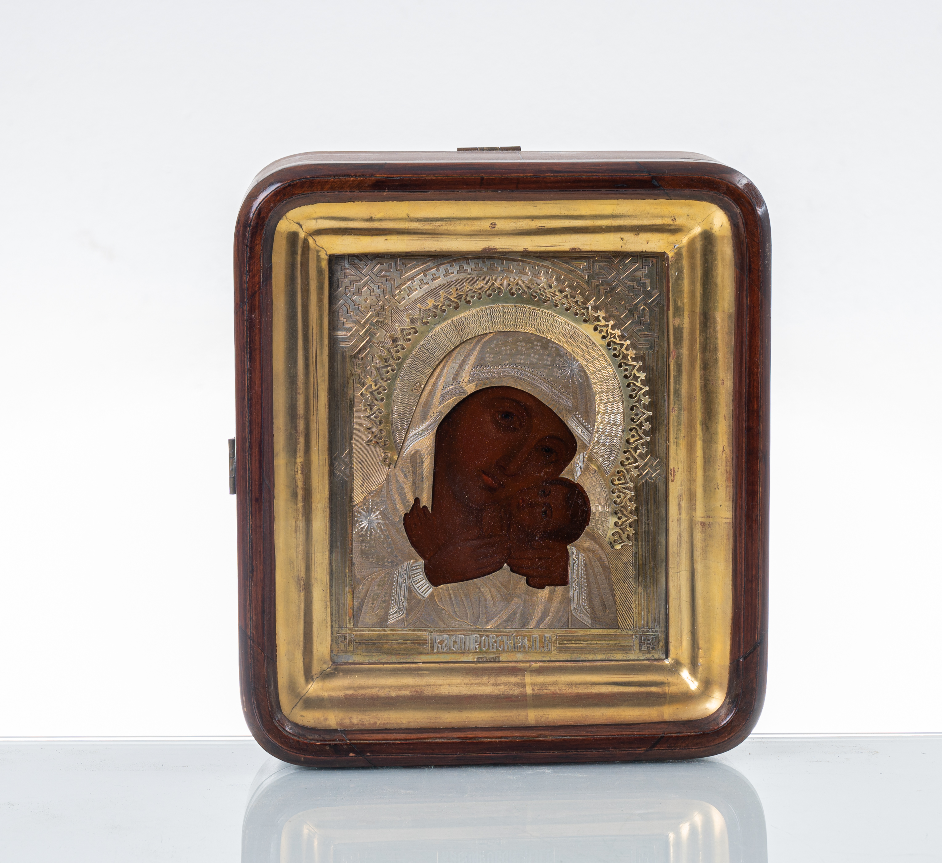 Icona dipinta a mano raffigurante "La Madonna con il Bambino" in legno con riza in metallo.