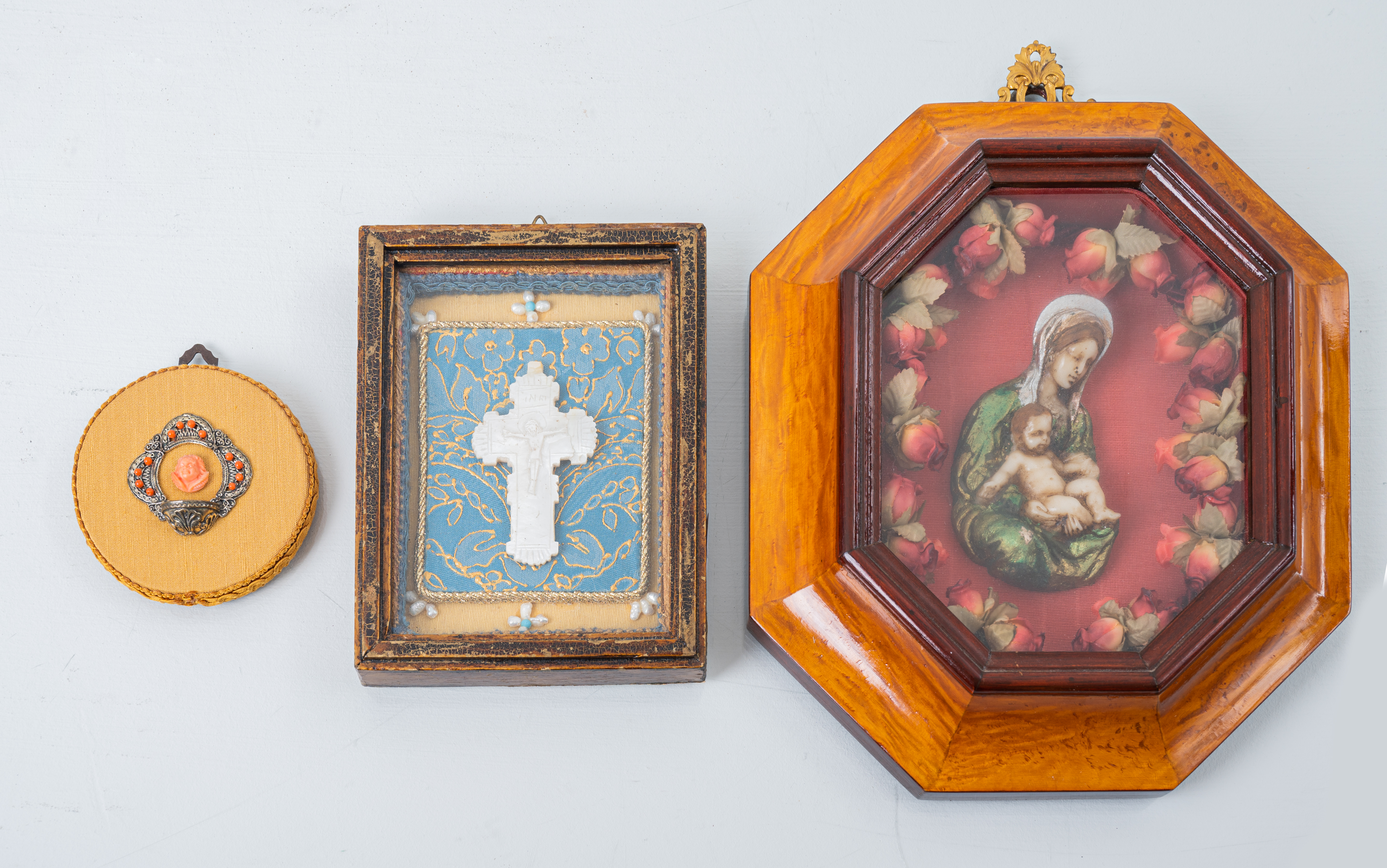 Teca in legno con scultura in ceroplastica raffigurante "La Madonna con Bambino" con fiori in carta, piccola teca in legno con croce in madreperla raffigurante "Cristo" con perline e turchesi e piccola acquasantiera in argento con decori e piccolo putto in corallo.
