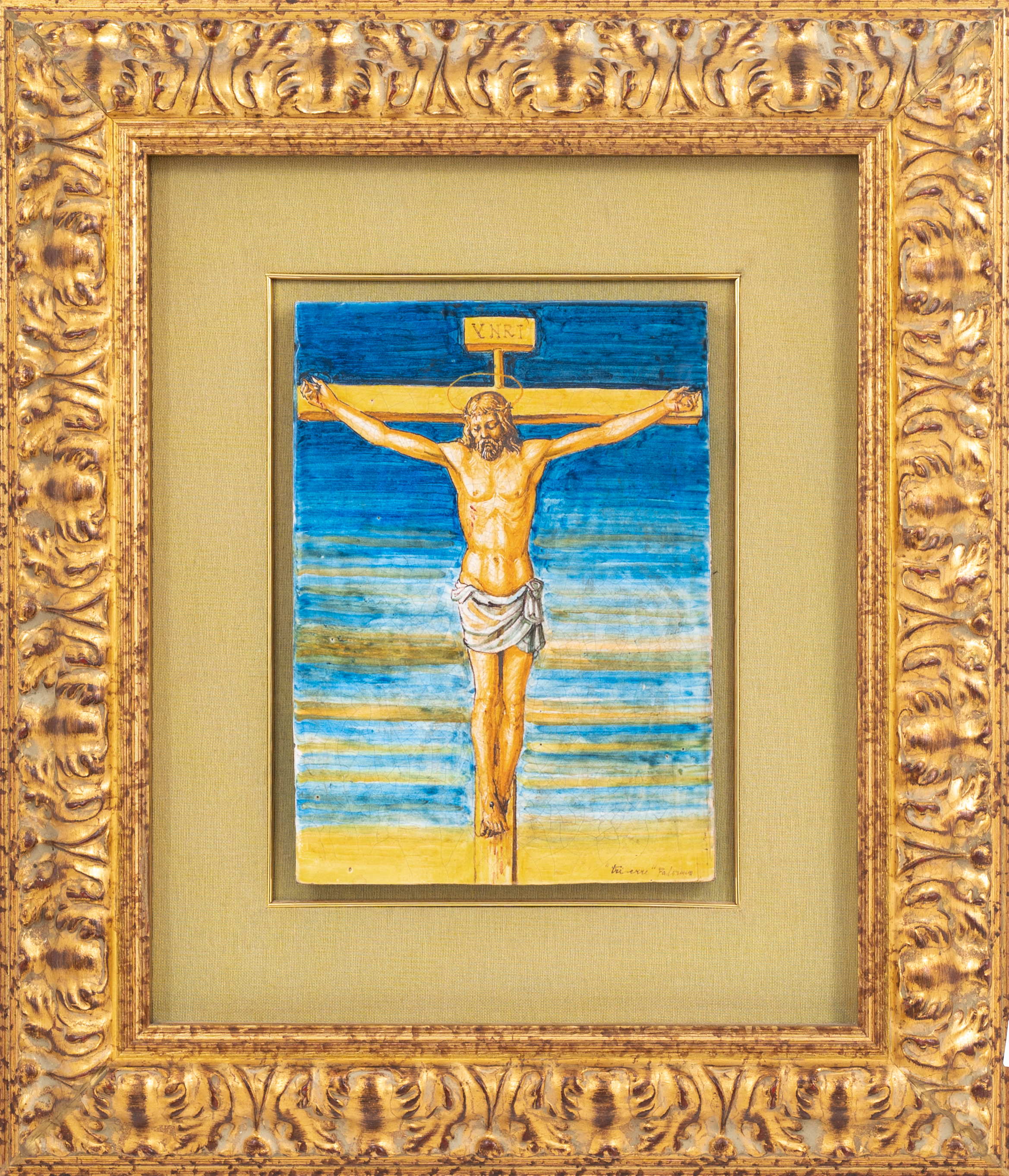 Mattonella in ceramica smaltata e decorata raffigurante "Cristo in croce" entro cornice.