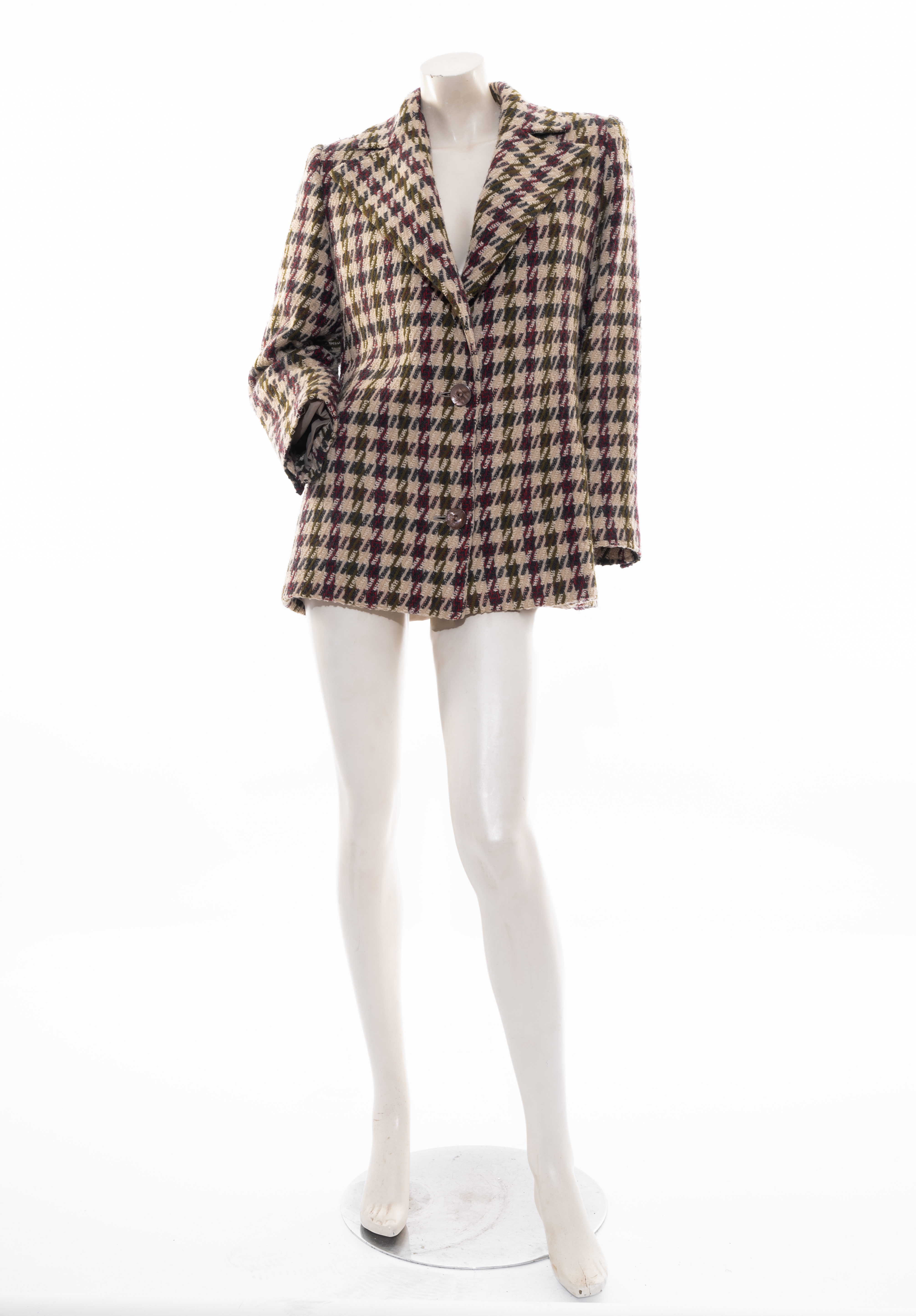 Giacca Valentino Boutique in tessuto di lana a disegno pied a poule panna, verde, bordeaux e grigio, collo monopetto, chiusura frontale con due bottoni in madreperla. Taglia L. Marchio di produzione.
