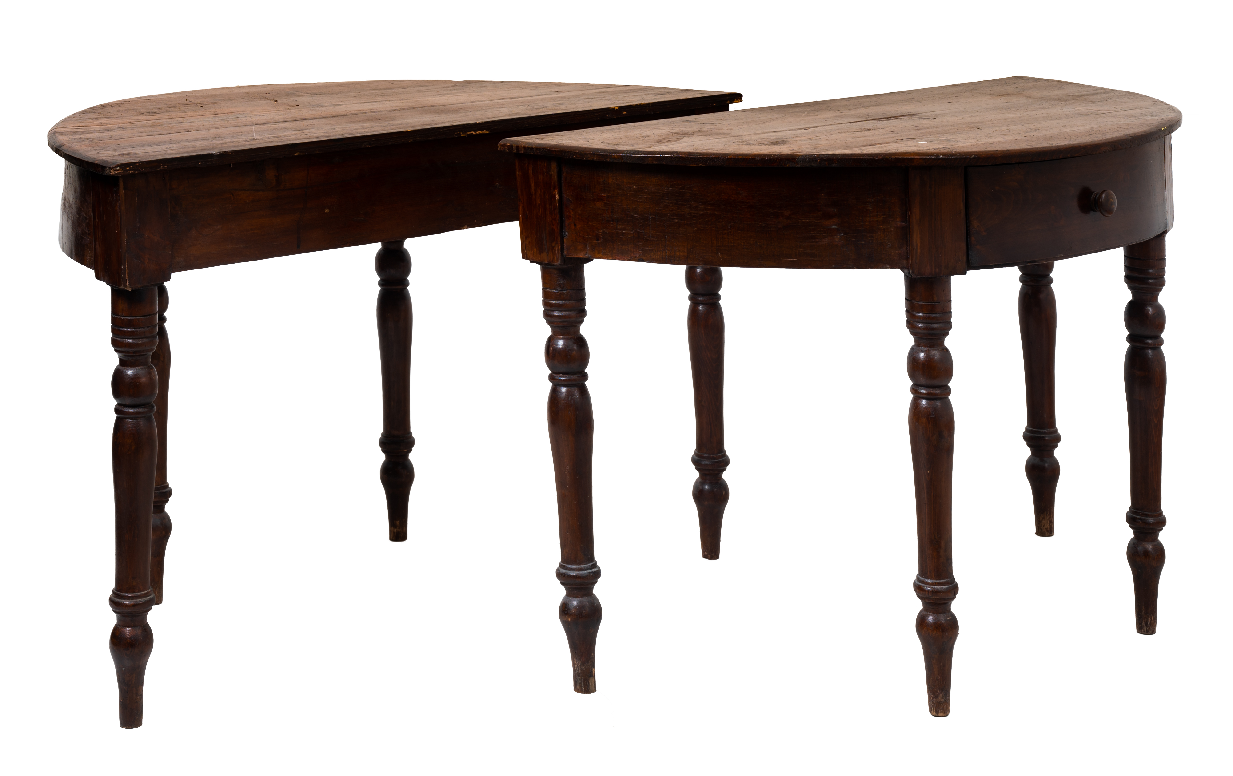 Tavolo a due mezzine con due cassetti in legno di abete.