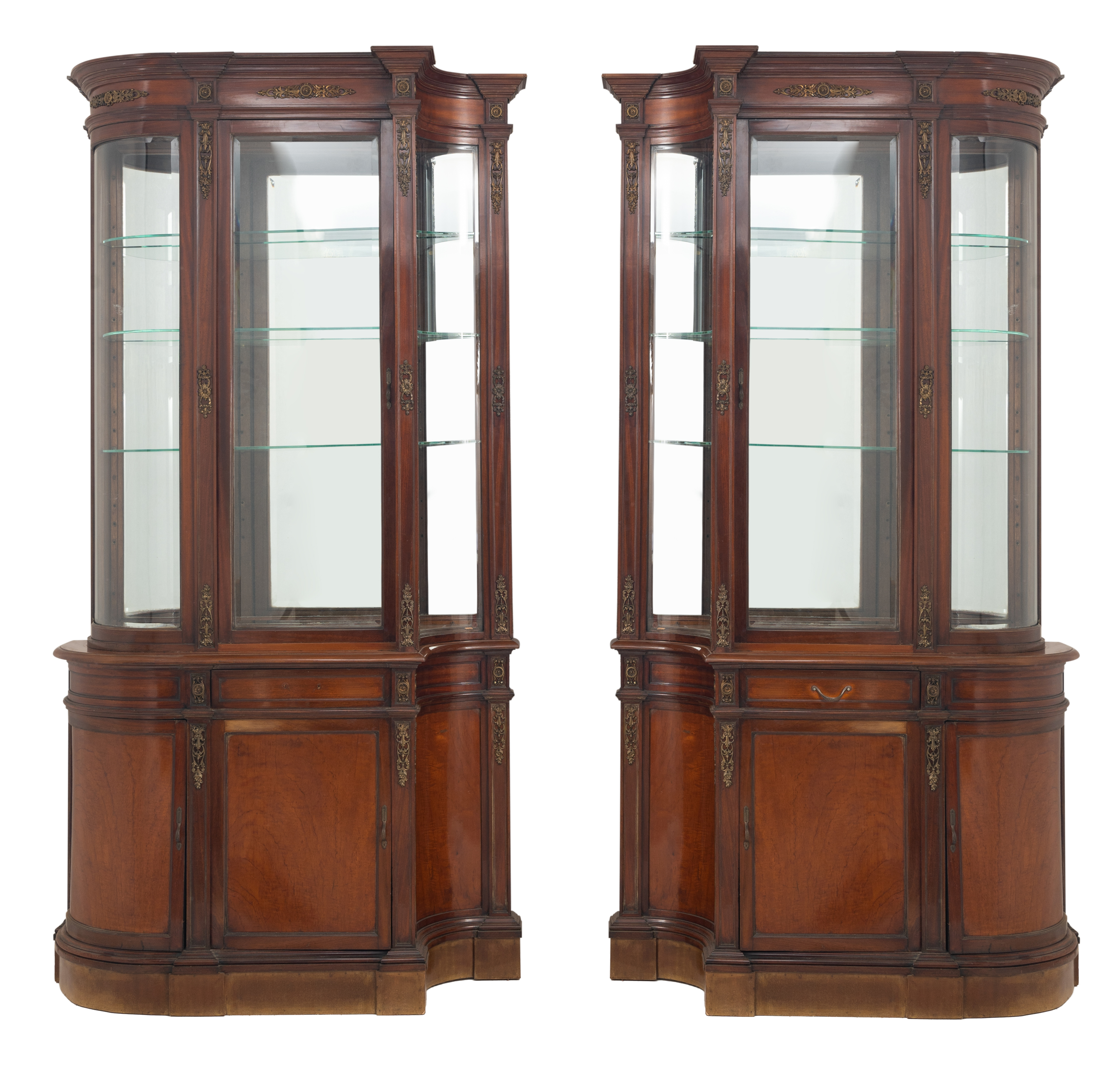 Coppia di credenze con vetrina di forma sagomata in legno di mogano guarnite da bronzi dorati.