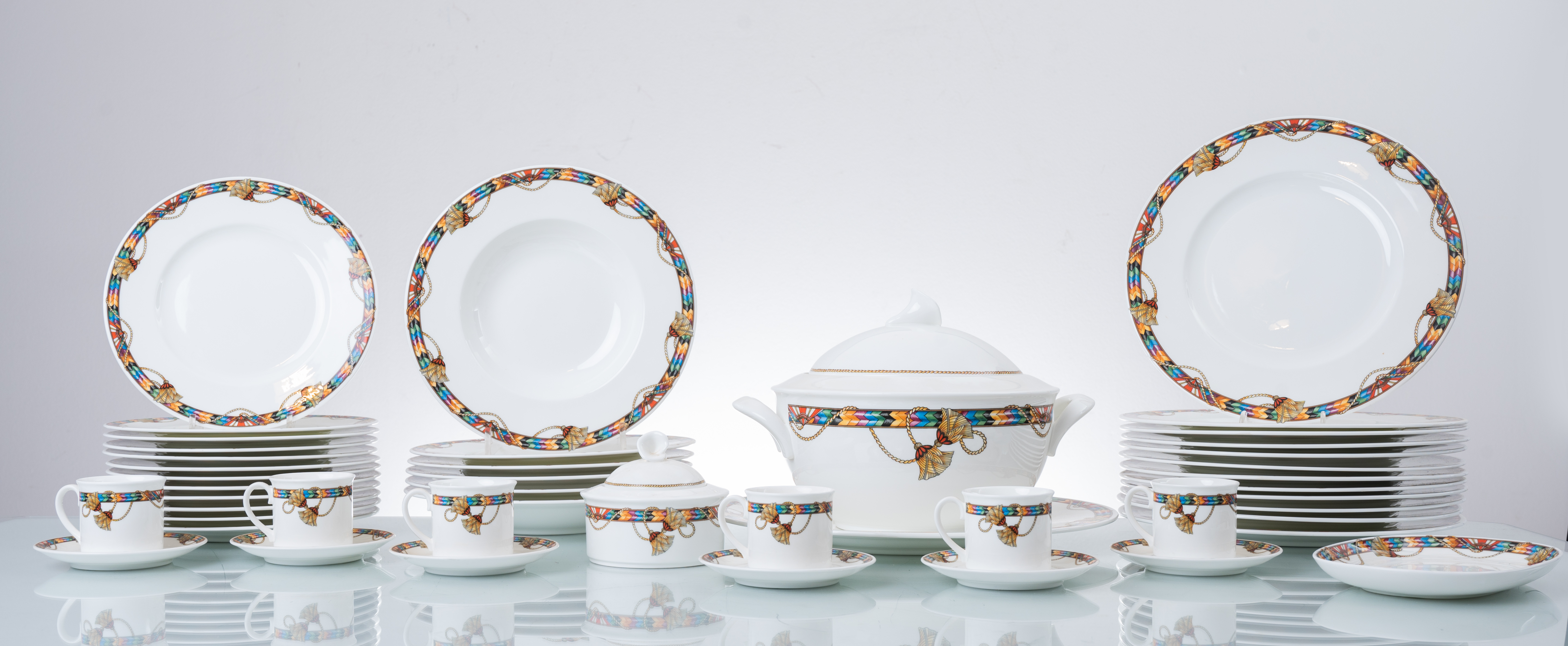 Servizio di piatti in porcellana composto da piatto da portata, zuppiera, raviera, 12 piatti piani, 6 piatti fondi, 12 piatti frutta, zuccheriera e 6 tazzine con piattino.