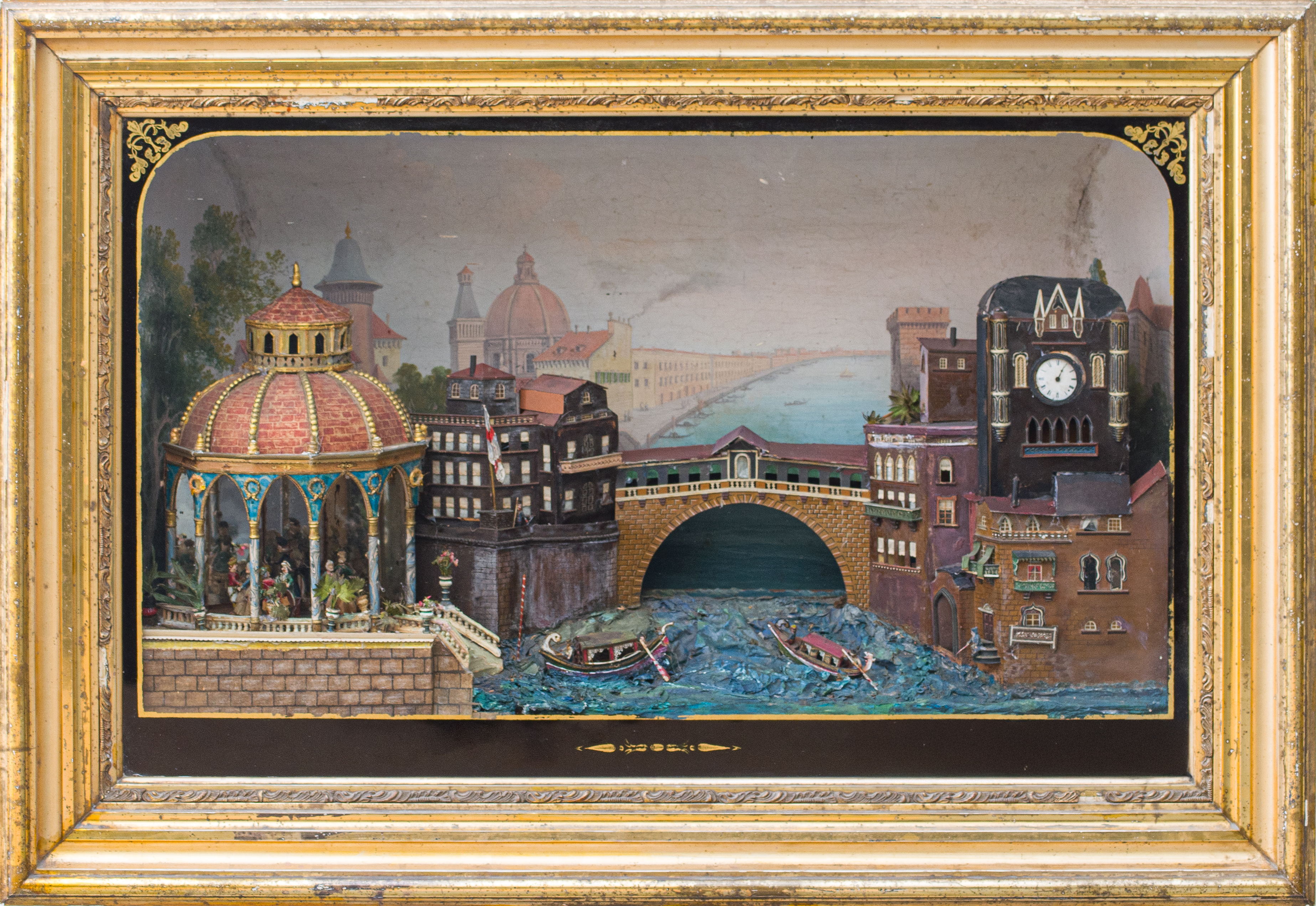 Automa in cartapesta dipinta e decorata in policromia raffigurante "Paesaggio cittadino con personaggi in festa e canale con barche", entro teca realizzata con cornice dorata ad oro zecchino (elettrificato).