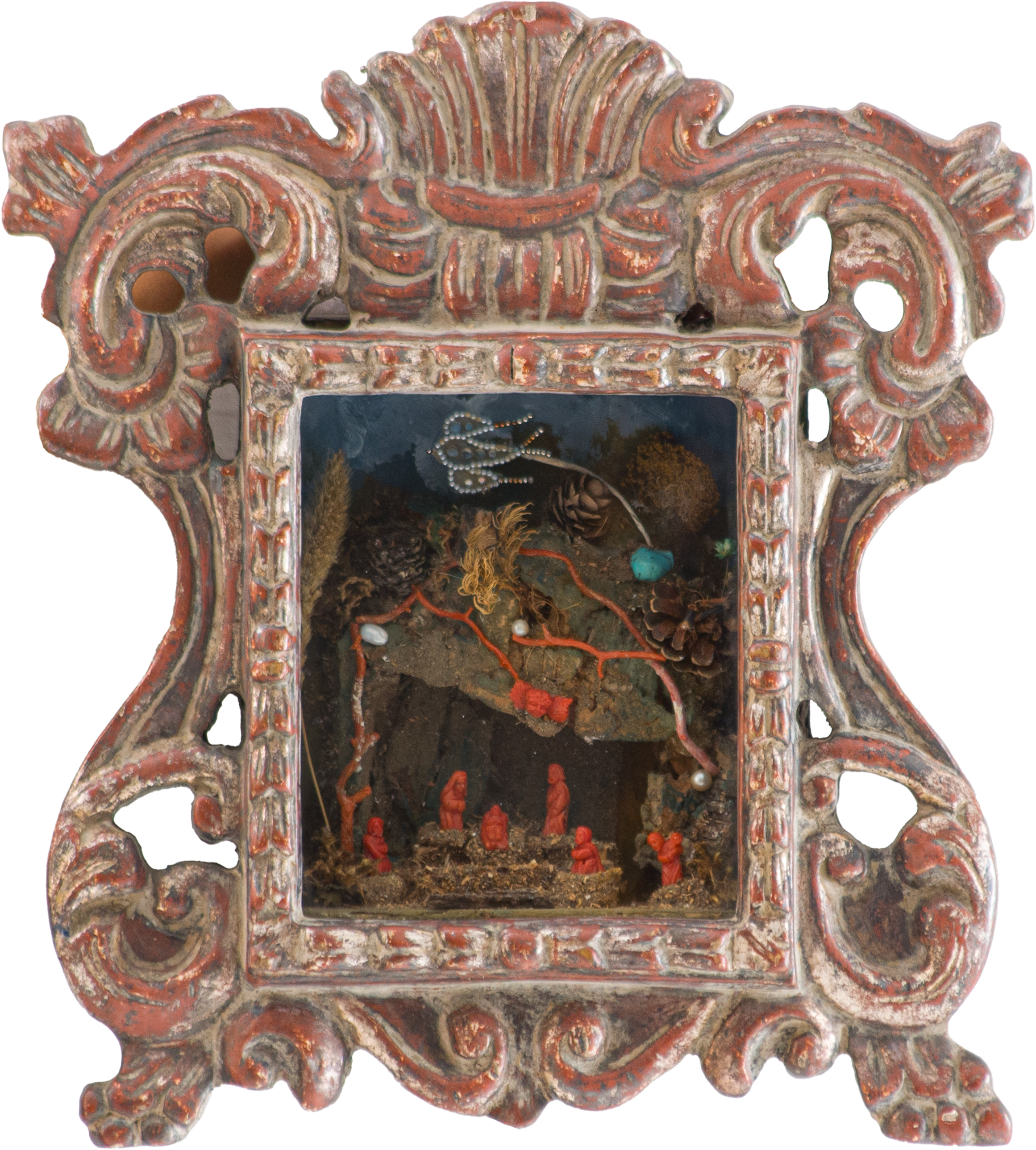 Presepe in corallo entro teca in legno con cornice in argento e mistura.