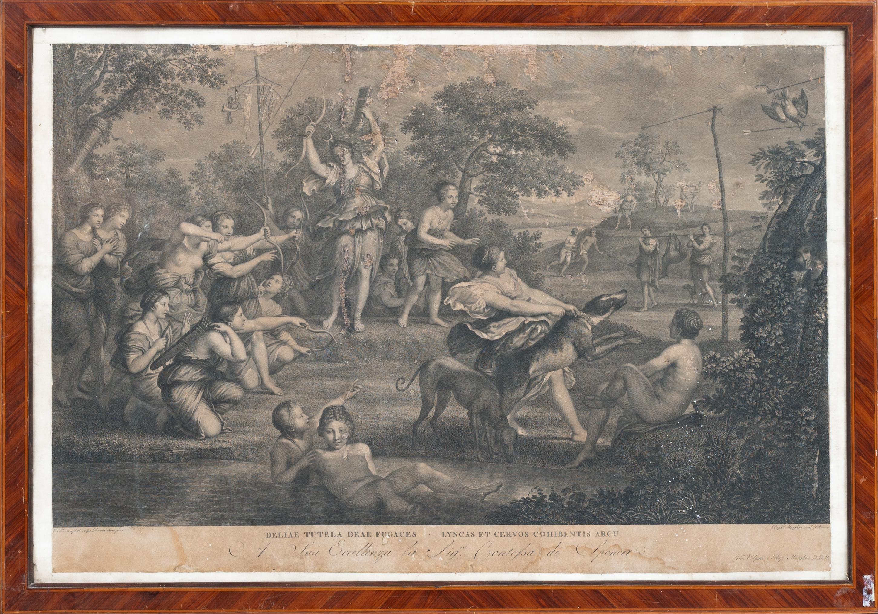 Incisione raffigurante "Diana cacciatrice con le ninfe" entro cornice (usure).