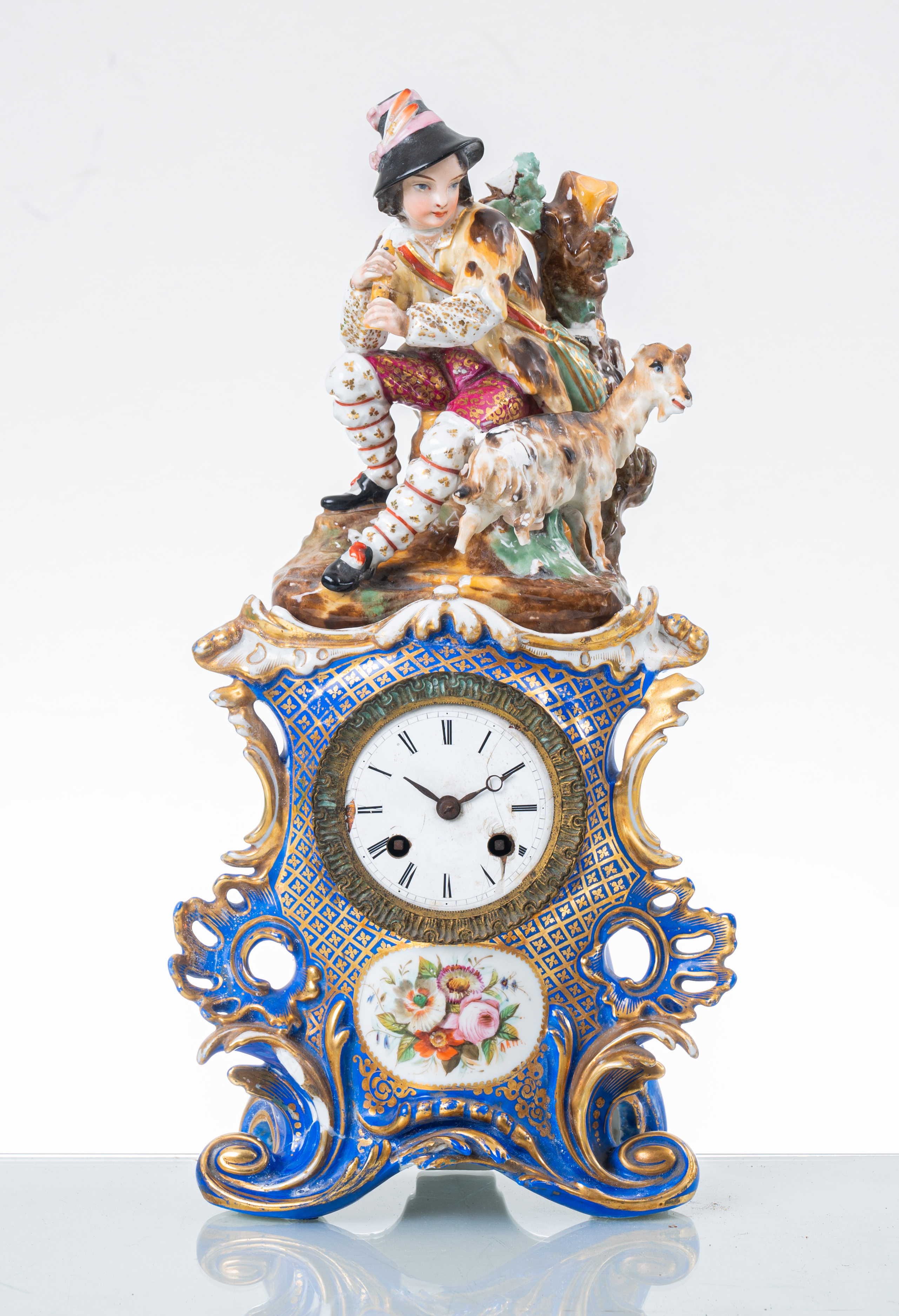 Orologio in porcellana Vecchia Parigi decorata e lumeggiata in oro, con scultura nella parte superiore raffigurante "Pastorello" (incollature, mancanze e restauri).