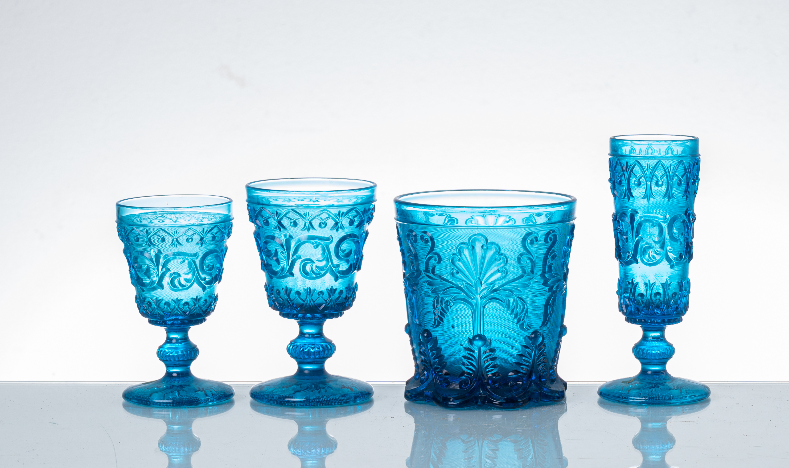 Servizio di bicchieri Liberty in vetro nei toni del blu composto da portaghiaccio, 30 bicchieri vino, 29 bicchieri acqua e 30 flutes.