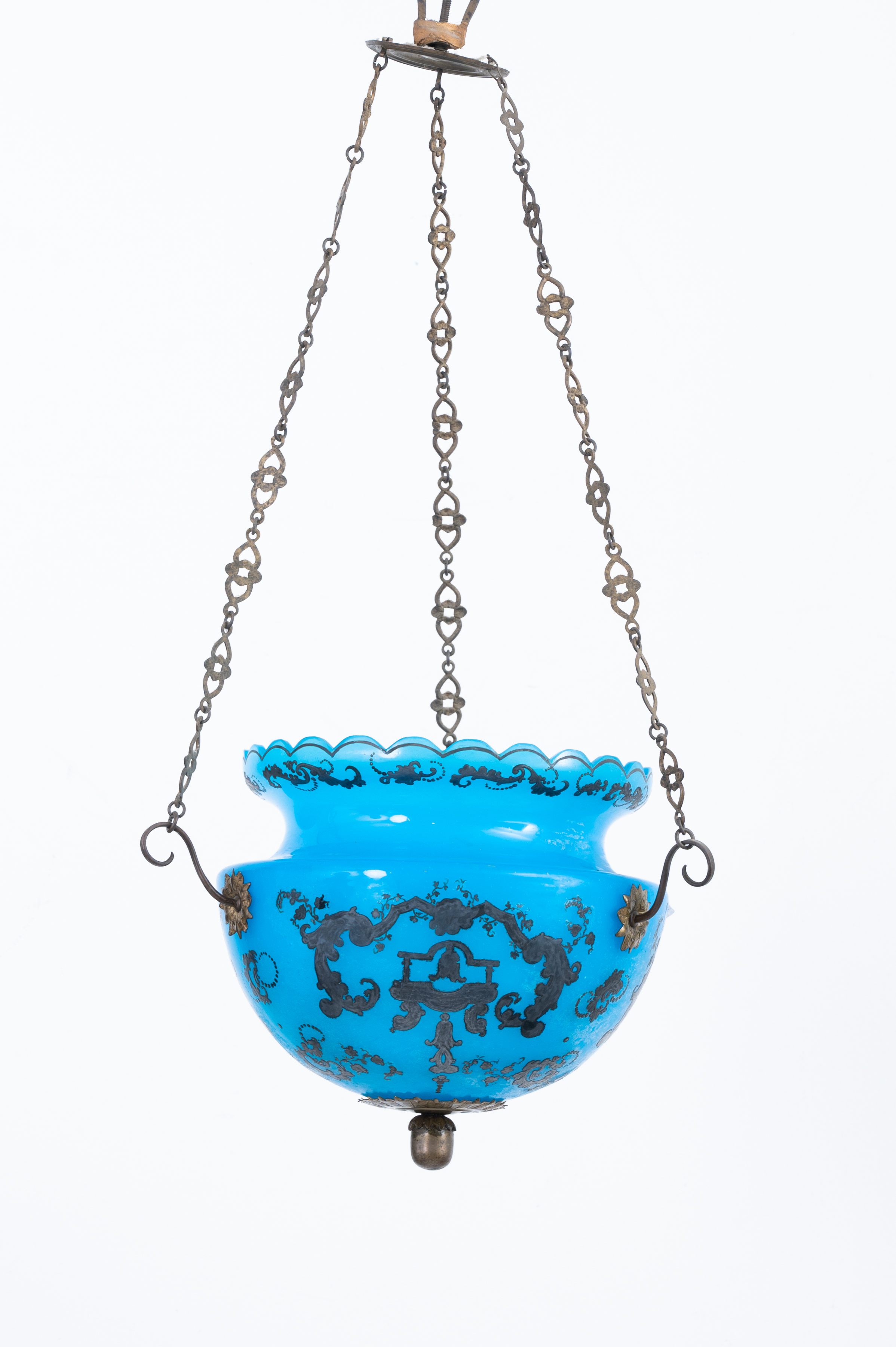 Lampadario ad una luce con boccia in vetro opalino nei toni del turchese inciso.