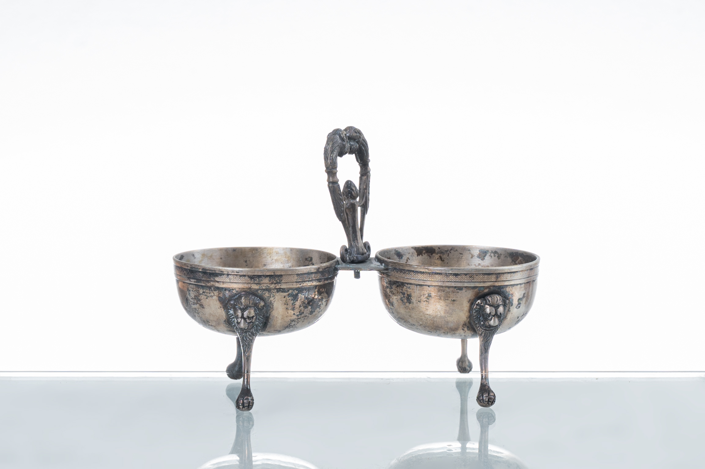 Saliera a doppia vaschetta in argento, piedi a zampa leonina, presa a guisa di teste feline (g. 235).