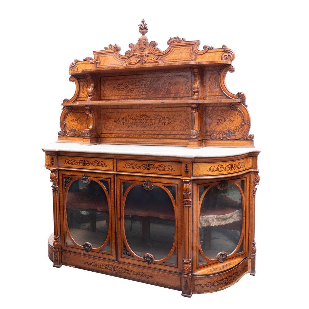 Etagere con alzata Carlo X in legno di acero fiorito e tarsie in palissandro, piano in marmo bianco di Carrara.
